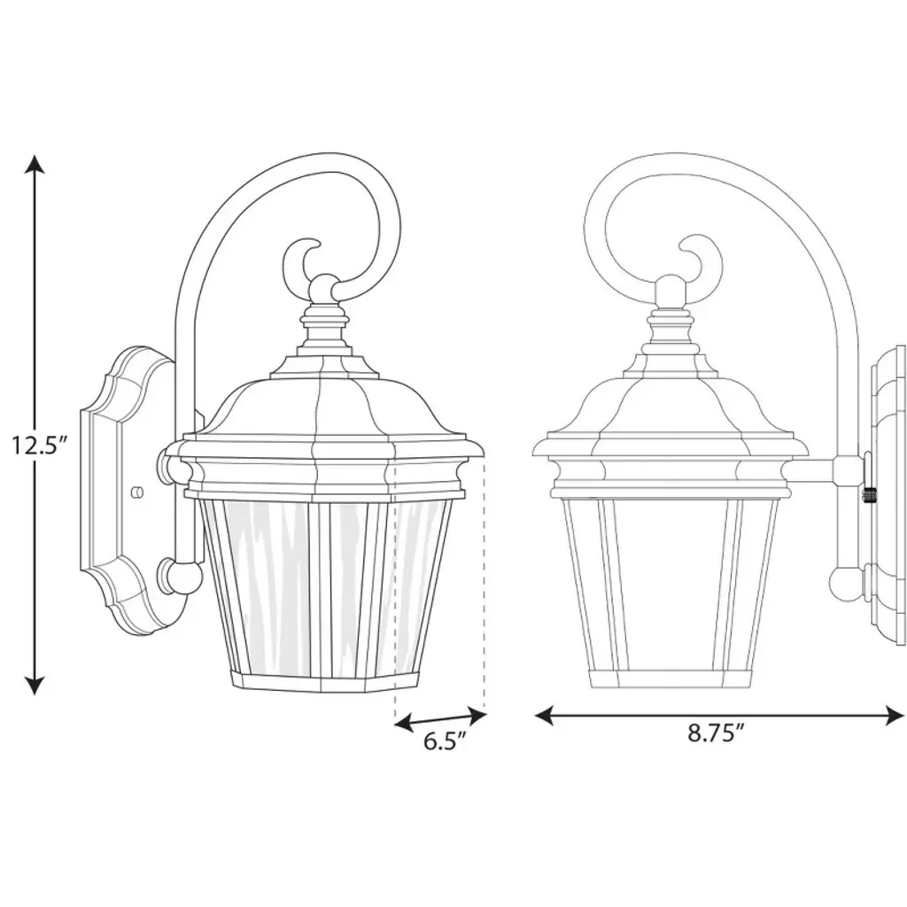 Introducing the Crawford Wall Lantern from Progress Lighting, a stunning addition to your outdoor space. Crafted from durable aluminum with a sleek black finish, this lantern exudes timeless elegance. The dimensions of 6.5" width, 12.5" height, and 8.75" depth make it a perfect fit for any exterior wall. The etched white glass panes emit a soft, inviting glow, housed within the classic black frame. With a moisture rating of wet, this lantern is designed to withstand the elements. This incandescent fixture requires one 100-watt bulb, creating a warm and welcoming ambiance. Assembly is required, and the backplate measures 4.5" in width and 7" in length. Elevate your outdoor decor with the Crawford Wall Lantern, a perfect blend of traditional charm and modern functionality.