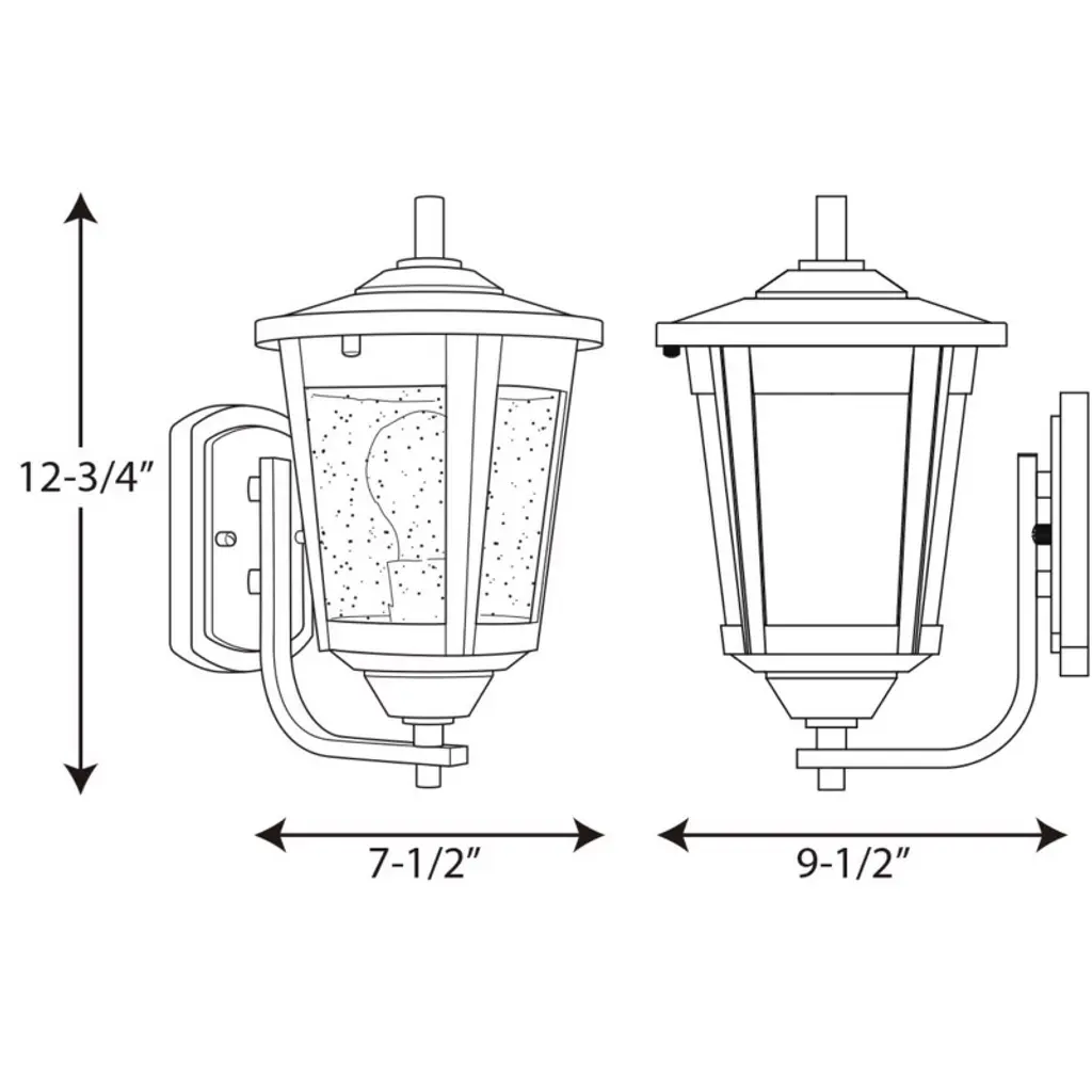 Introducing the Progress Lighting East Haven Collection, a modern and versatile addition to your outdoor space. Crafted from durable aluminum with a sleek black finish, this one-light medium outdoor wall lantern measures 7.5" wide, 12.75" high, and 9.5" deep. The fixture is designed for wet rated areas and features a height from the outlet box of 7.25". The backplate measures 4.31" in width and 6.06" in length. The seeded glass shade adds a touch of elegance, while the incandescent bulb with a wattage of 100 watts provides ample illumination. The East Haven Collection offers a range of mounting options, including hanging, wall, and post fixtures. Elevate your outdoor decor with the timeless appeal of the East Haven Collection.