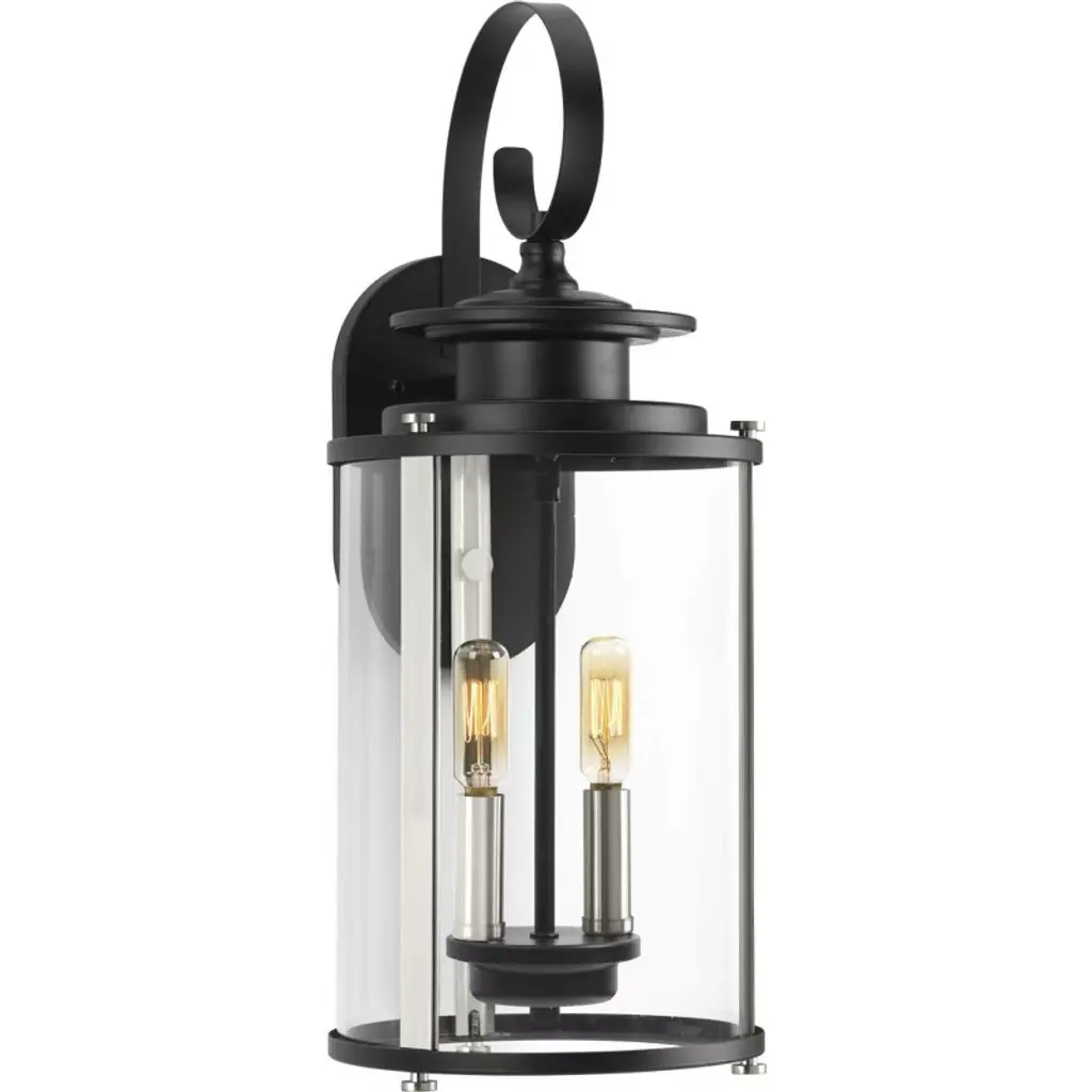 Introducing the Squire two light medium wall lantern from Progress Lighting. This classic traditional lantern is crafted from durable steel with an Antique Bronze finish and Vintage Brass accents, creating a timeless and elegant look. The cylindrical frame features a clear glass diffuser, adding a touch of modernity to the design. With a width of 8" and a height of 19.25", this wet-rated lantern is suitable for outdoor use. It includes a backplate measuring 7.88" in height and 4.5" in width, and comes with two incandescent bulbs with a wattage of 60 watts each. The Squire wall lantern is the perfect combination of traditional charm and contemporary style, making it a stunning addition to any outdoor space.