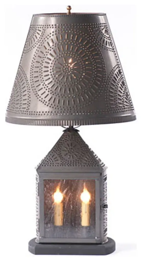 The Harbor Lamp is well-balanced and sized for larger areas of your home. Designed by Irvin to resemble the antique lanterns of years gone by, this lamp has a classic and sophisticated charm.Two candelabra sockets in base, 25 watts max. standard socket in top, 150 watts max., and a 3 way switch. Base has a 7'' cord and includes a 9" harp and finial Blackened Tin finish. Handcrafted in Pennsylvania. Includes a 14" Fireside Shade in Blackened Tin #816-4CBT. Lamp base and shade are sold separately under related items below.Measures 26.5-Inches high and 14-Inches diameterHas a 7-foot cord and line switch; Plugs into wall outlet; Top center has a standard socket, 1 x 150 watts max; Bottom has candelabra sockets, 2 x 25 watts max; 3-way switchBULBS NOT INCLUDED UL listed for dry locations Shade included Made in USA