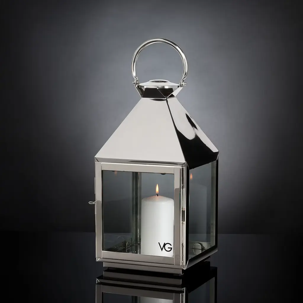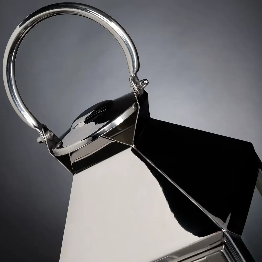Defined by a small and angular silhouette, this exquisite lantern features a dainty silhouette with a pyramidal top equipped with a practical ring perfect for hanging or holding. Entirely handcrafted of polished stainless steel, it can be displayed in both an outdoor or indoor area with a real or electronic candle (not included).