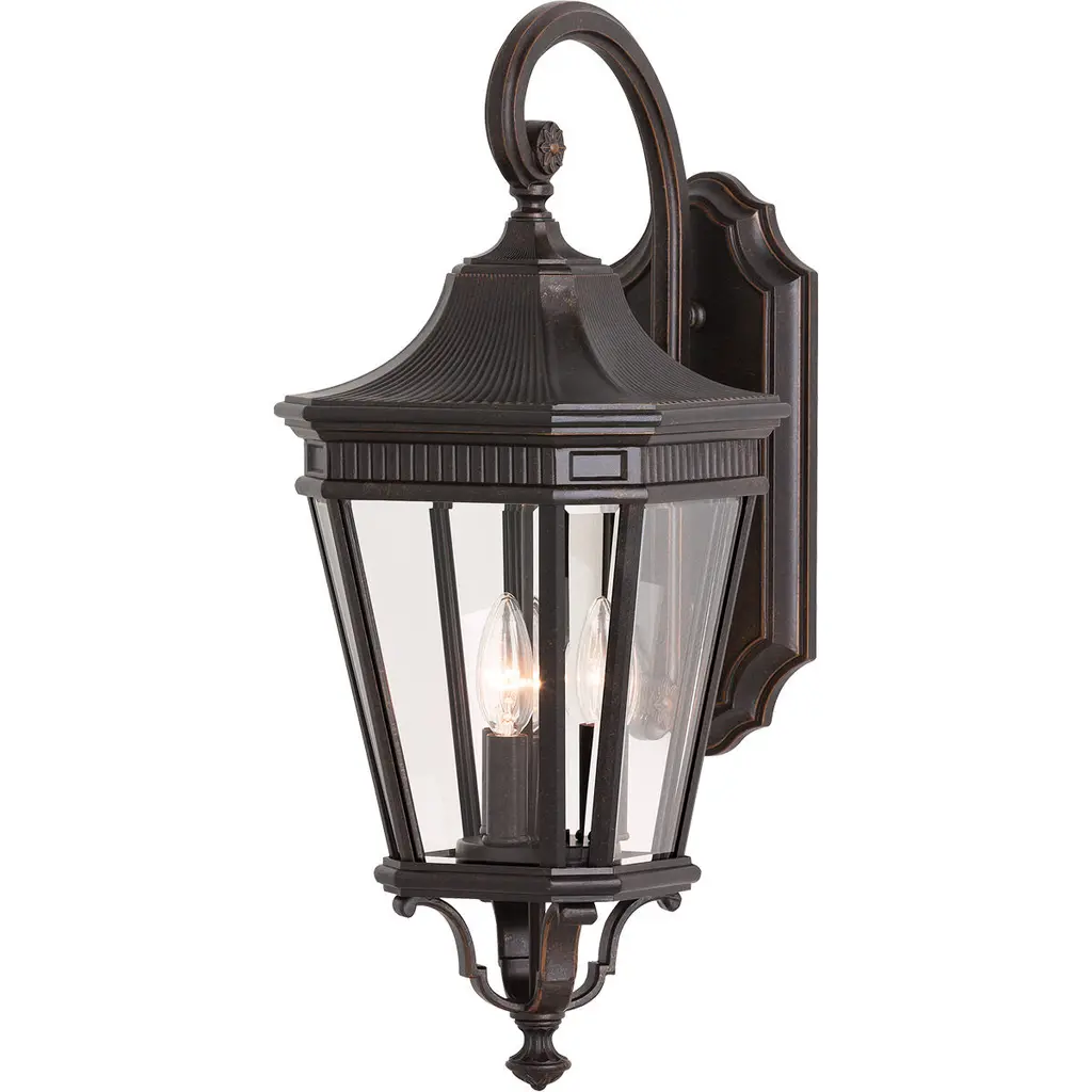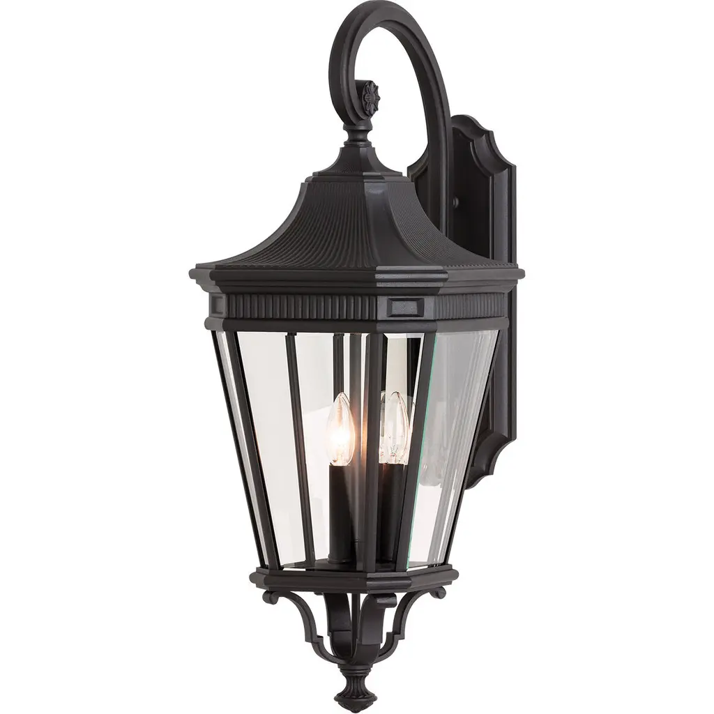 The traditional, antique gas lantern-inspired design of the Quade Collection features dentil molding at the top of each pane of beveled glass. Quade's profile is timeless and elegant. Available with two finish and glass options: a Black or Grecian Bronze frame with Clear Beveled glass or Clear Seeded glass panels.