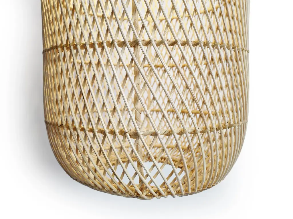 Stunning raw wicker cylinder pendant lantern. Elegant elongated shape with open bottom for direct downward light makes this a great choice for many interior spaces. May be used outdoors undercover. More sizes available to display in groupings. Each may vary in exact tones/grain and handmade differences. Comes with 3' black hanging chain and ceiling canopy. 100 watt max fixture. Bulb not included. Each sold individually.