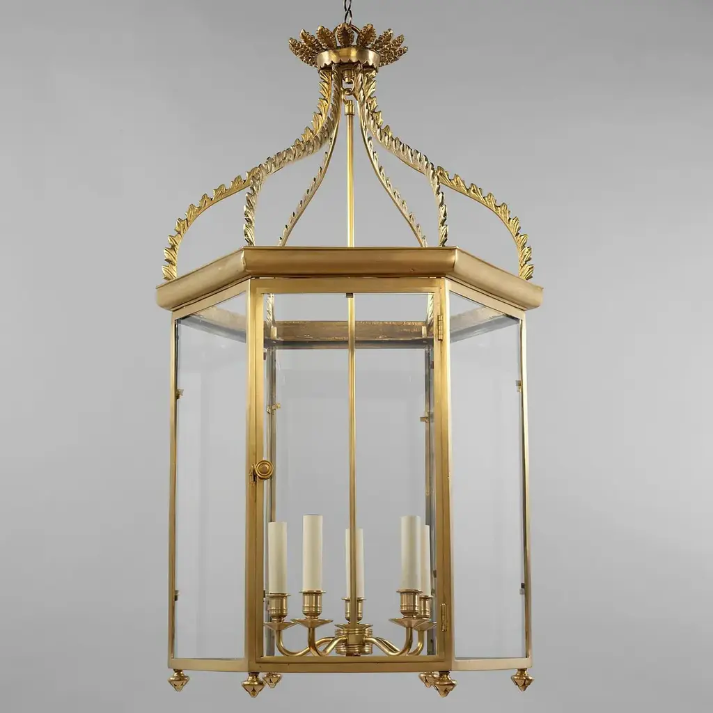 This classic lantern is based on a 19th-century six-sided original. Superbly cast, it demonstrates a range of techniques, from the finely crafted frame to the ornately decorative upper section, finished with feathered detailing and a leaf-like top coronet. Hand-fabricated from solid cast brass, with an antique brass finish, and glass panels. Dimensions: 21" W x 21" D x 37" H Supplied with 39” of chain. Allowing for a total drop up to 81.25”