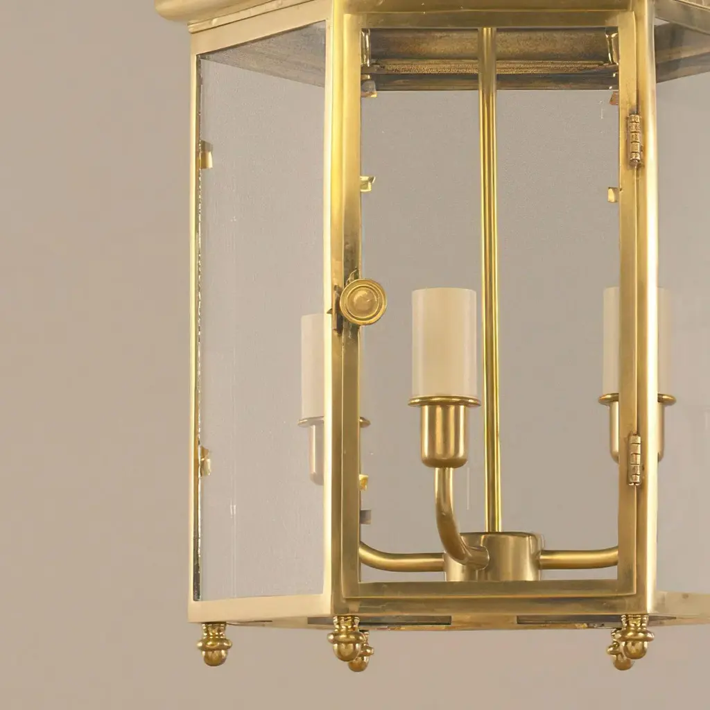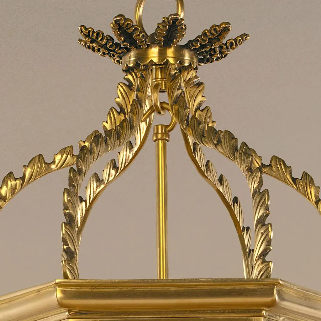 Regency Hall Lantern. This classic lantern is based on a 19th-century six-sided original. Superbly cast, it demonstrates a range of techniques, from the finely crafted frame to the ornately decorative upper section, finished with feathered detailing and a leaf-like top coronet. Hand-fabricated from solid cast brass, with an antique brass finish, and glass panels. Dimensions: 12" W x 12" D x 25" H Available in brass, bronze or nickel finishes and in a range of sizes. This is the smallest. Supplied with 39” of chain. Allowing for a total drop up to 66¼”