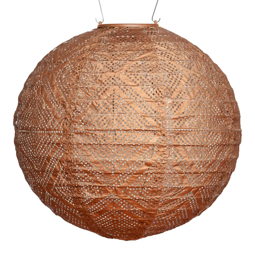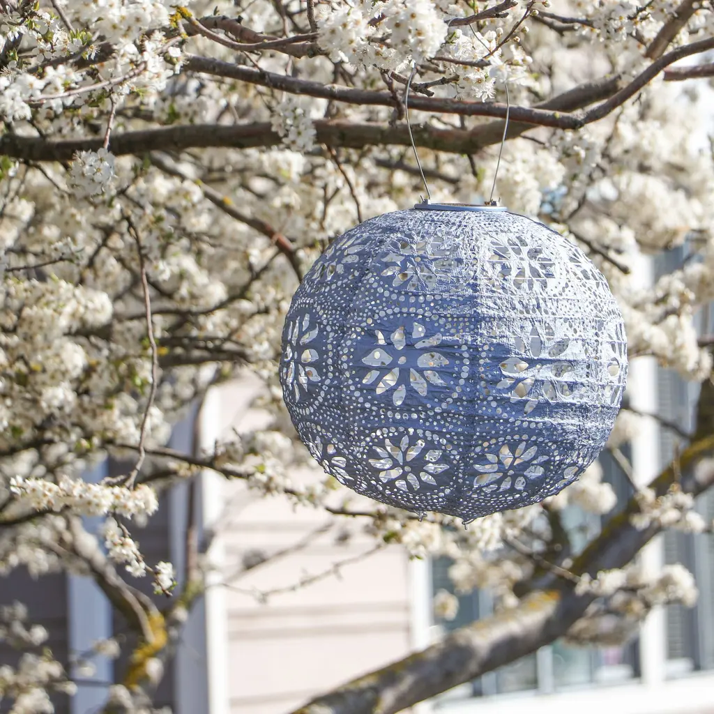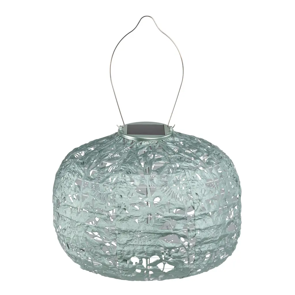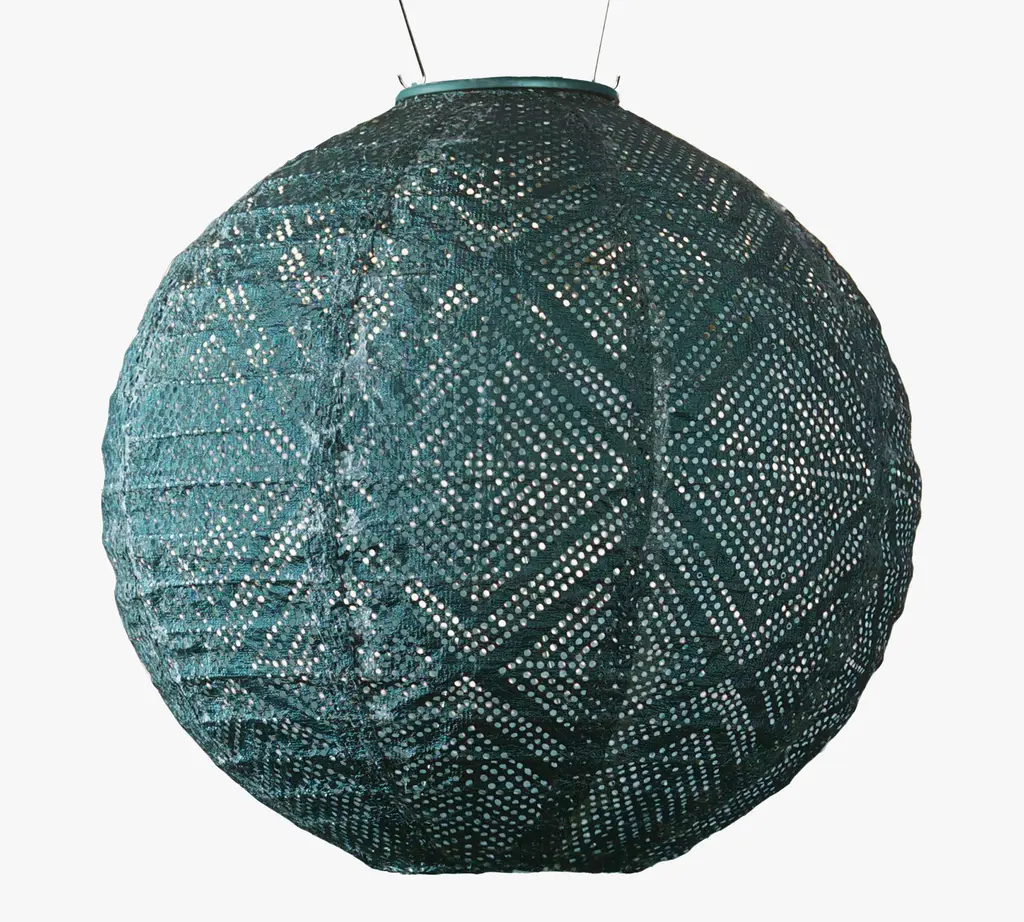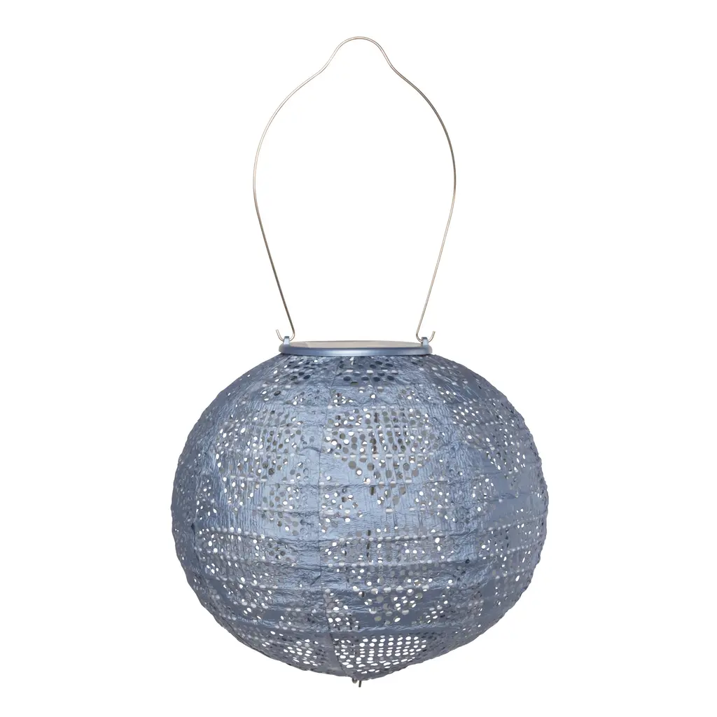 Handmade of durable fabric in a round globe shape, this solar-powered LED lantern filters light through a lace-like punched geometric pattern. Equipped with a stainless-steel hanging handle, this weather-resistant outdoor light soaks up sunlight for automatic illumination after dark. In three coordinating hues, this glowing lantern creates a festive atmosphere hung in multiples around your outdoor entertaining space.