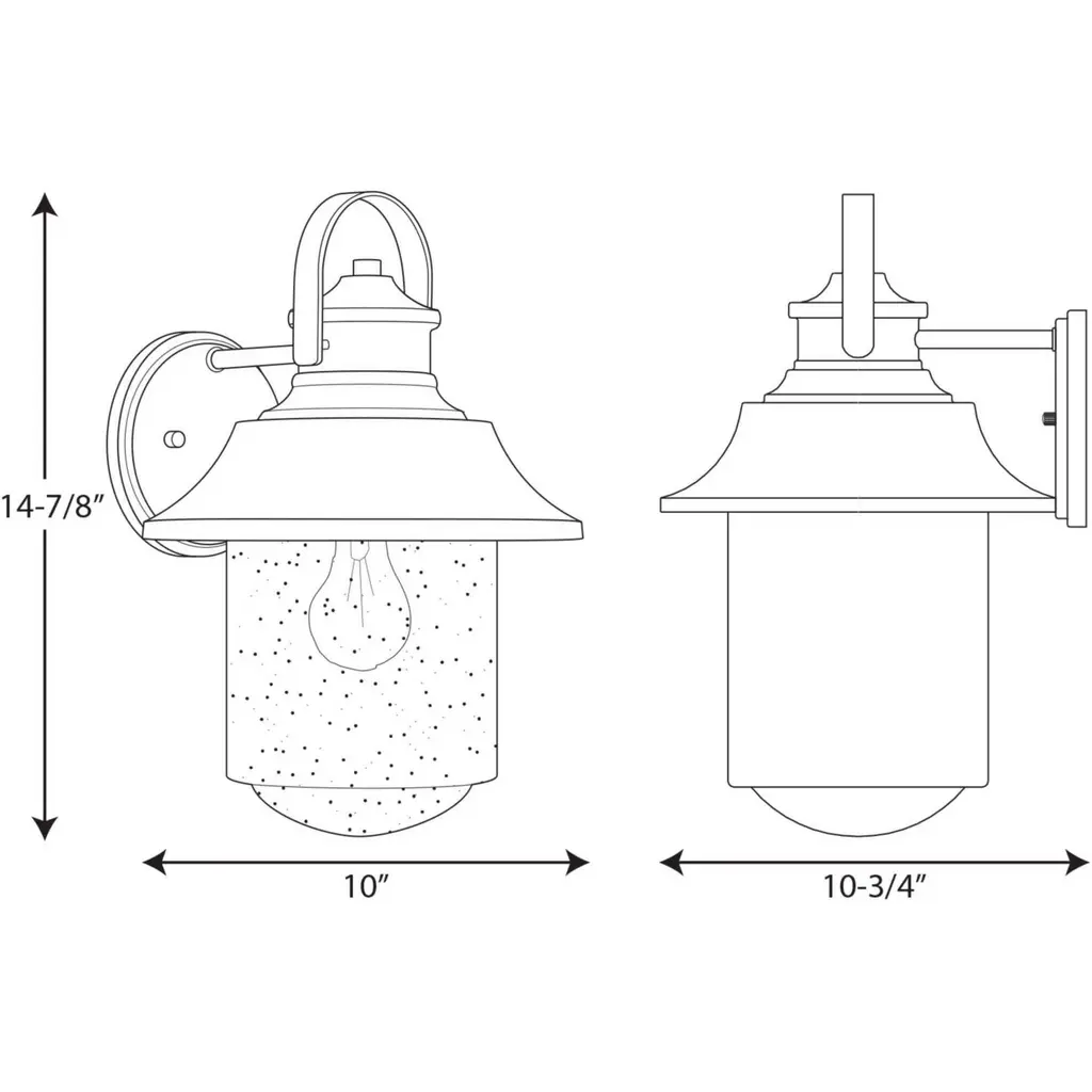 Featuring nautical influences, Saddletree delivers a large wall lantern ideal for Farmhouse or Transitional architecture designs. Curved clear seeded glass is topped with an ample roof in Black.