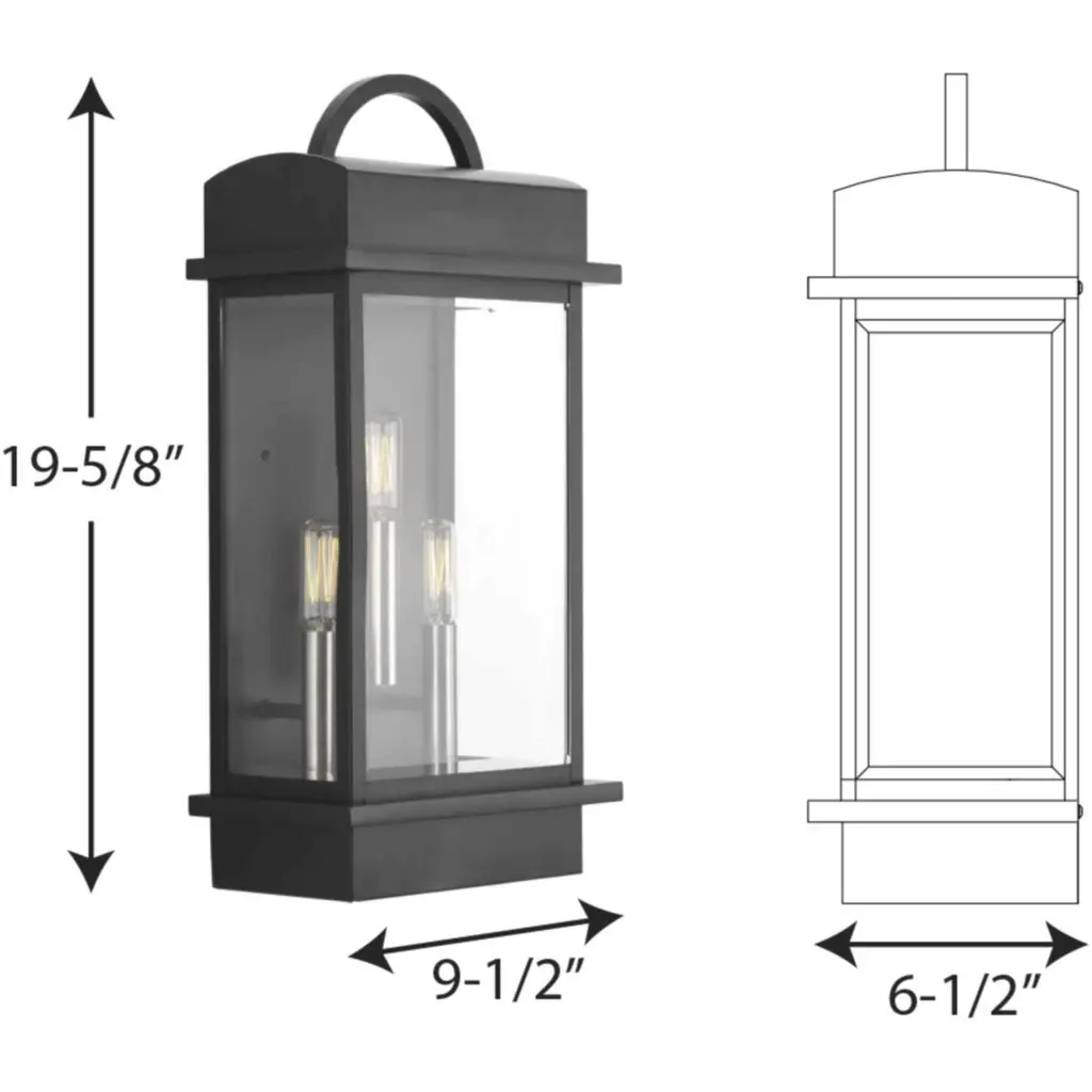A classic three-light wall lantern with contemporary touches describes Santee. Featuring a geometric frame and graphic handle, the wider beveled glass offers more refraction - and visual interest - than typical lantern designs and a Black frame with stainless steel candles.