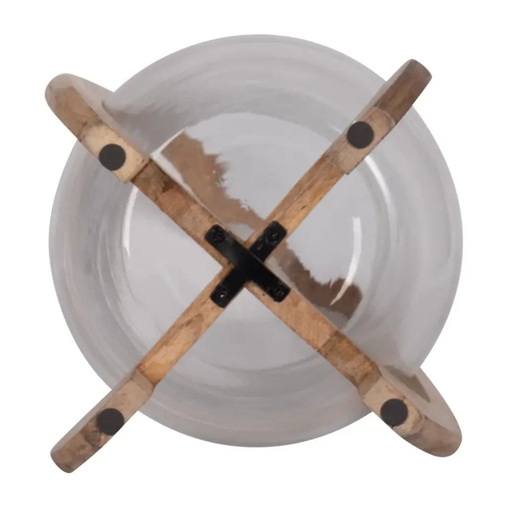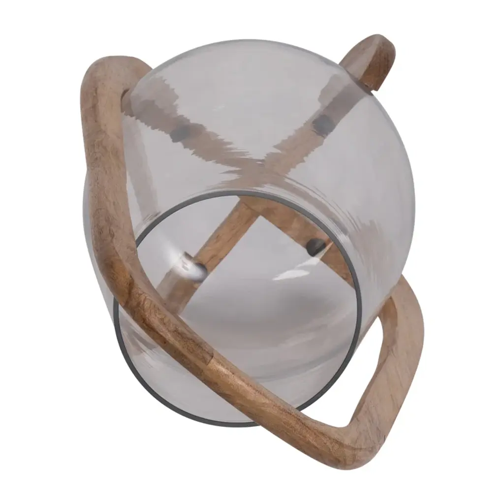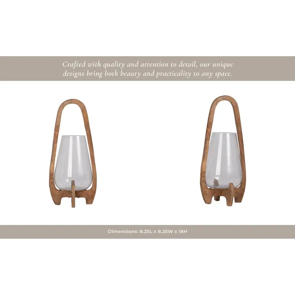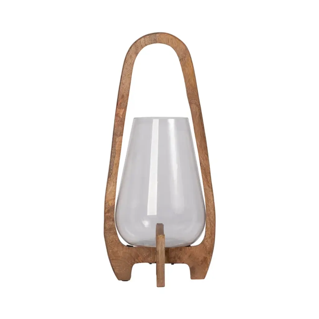 Add sculptural style and homey candlelight with this tabletop lantern. Crafted from wood, the curving frame pairs clean lines with organic warmth for a modern yet timeless look. A rounded bowl-like clear glass shade can hold a single 3" pillar candle (sold separately). Its small size works beautifully on coffee tables in your living room or covered patio. Plus, this lantern's minimalist design makes it easy to blend with other decor or stand out as a bold centerpiece.