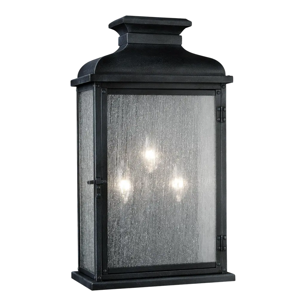 Inspired by distinctive outdoor lanterns commonly found throughout the streets of London, the crowning detail of the traditional Pediment outdoor lighting collection by is its classically, curving roof line. The hinged and latched front panel adds a historical reference and also makes relamping easy. The Clear Seeded glass subtly obscures the lamping and helps create the visual appearance of vintage gas lanterns. Offered in a Dark Weathered Zinc finish, all fixtured rated for wet locations. Designer: Sean Lavin Shade/Glass: No Option. Lamping: 3 Torpedo Candelabra 60 watt light bulbs Voltage: 120 Bulb Included: No Safety Rating Location: wet