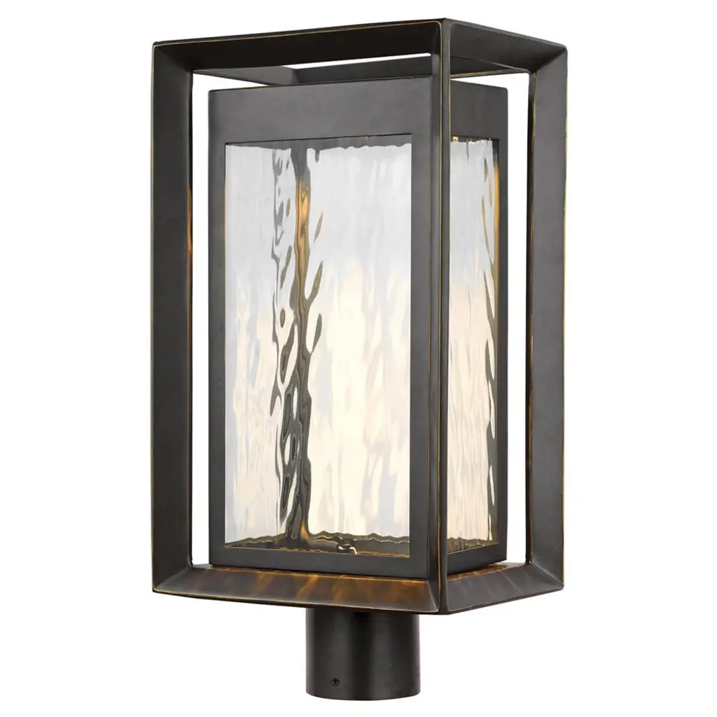 The Urbandale one light outdoor post top in antique bronze creates a warm and inviting welcome presentation for your home's exterior. The Urbandale outdoor collection by has a modern design which features beveled edges achieved with the fine precision of crisp die-cast construction. Both incandescent and LED versions are available, and each offer slightly different aesthetic. The incandescent version is offered in the Antique Bronze finish which nicely contrasts with the Painted Burnished Brass finish on the squared-off candle holders and Clear Seeded glass to subtly obscure the light source. The LED version is offered in an Antique Bronze finish with Clear Water glass.