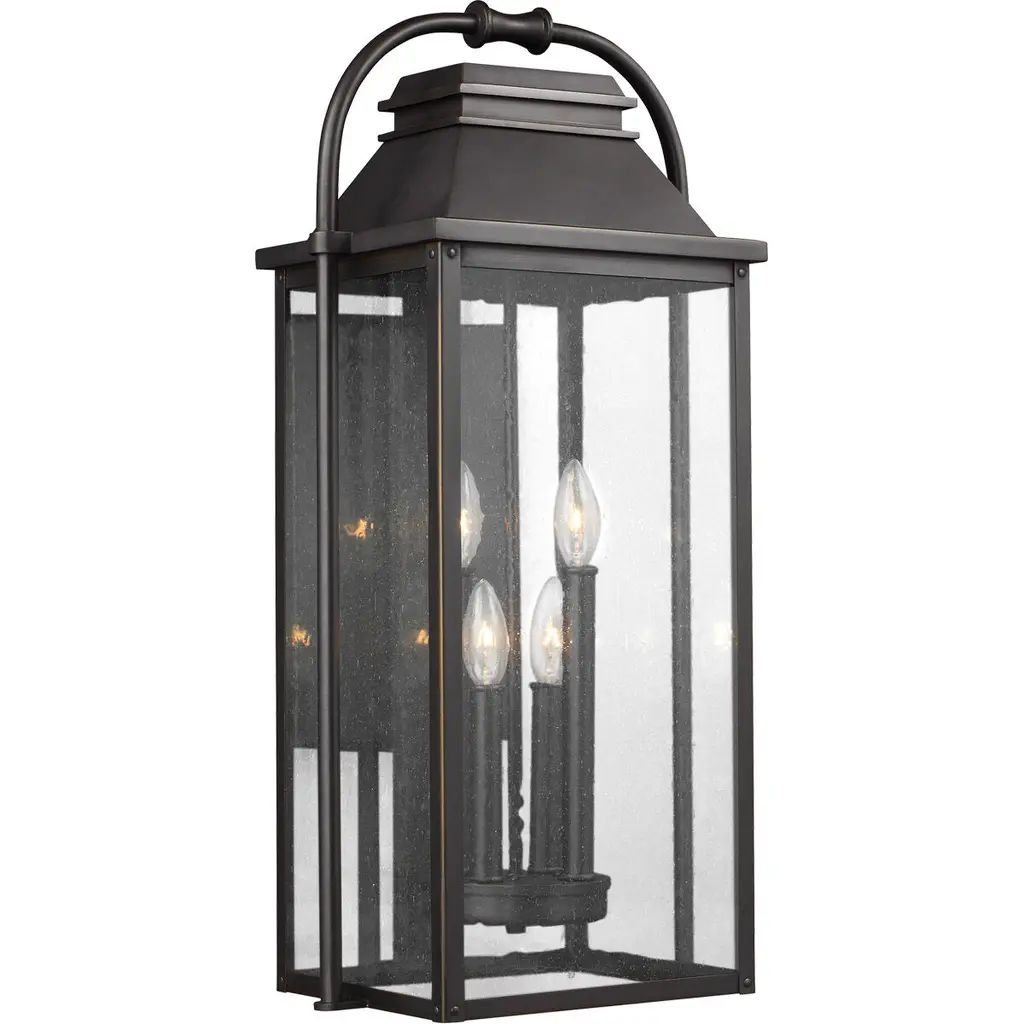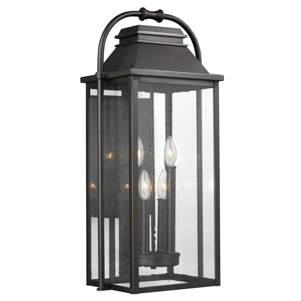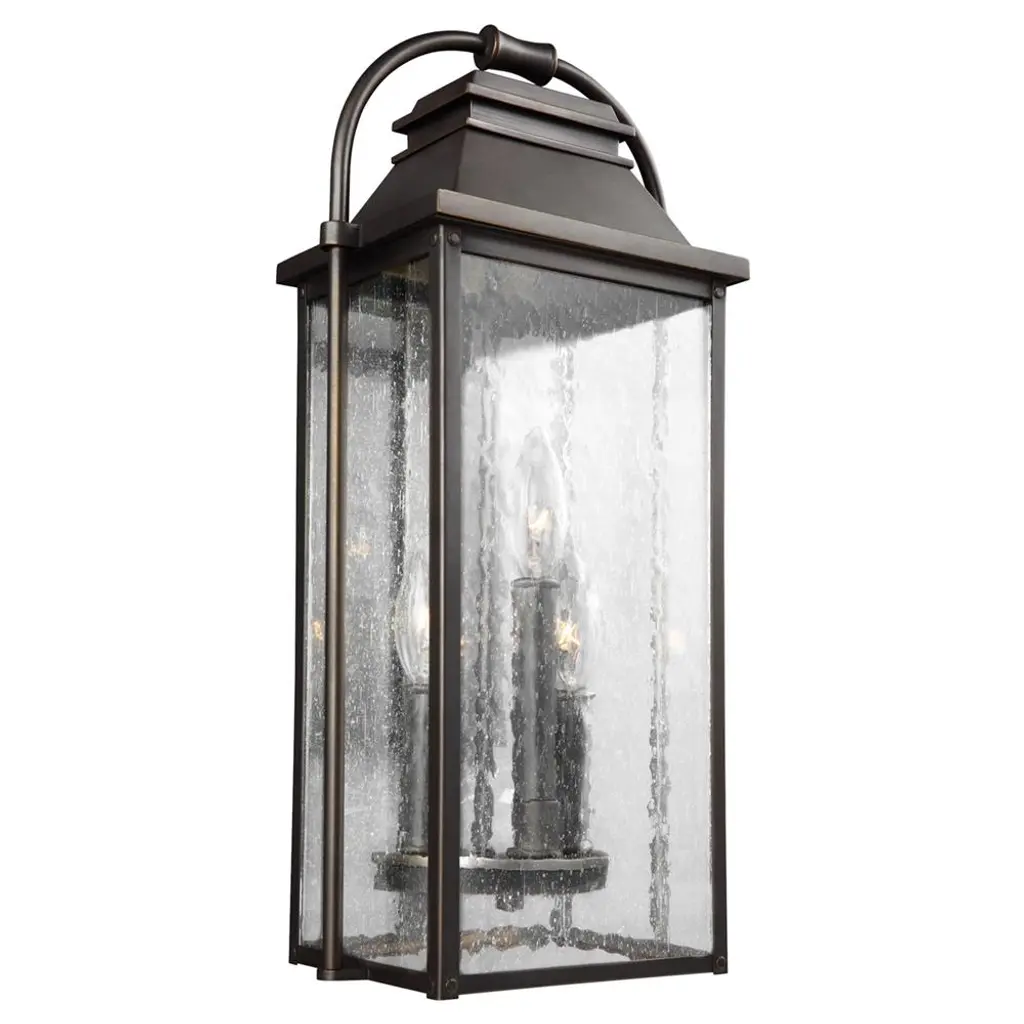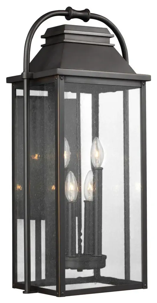 With its classic silhouette and sophisticated accents, the Sean Lavin Wellsworth Lantern from Visual Comfort & Co will add a touch of elegance to your entryway, porch, balcony or backyard. Crafted from cast aluminum and featuring a handle-like accent and clear seeded glass panels, its three candle structures produce a warm, diffused light that will illuminate any outdoor space. Make a statement and bring timeless style to your home. Highlights