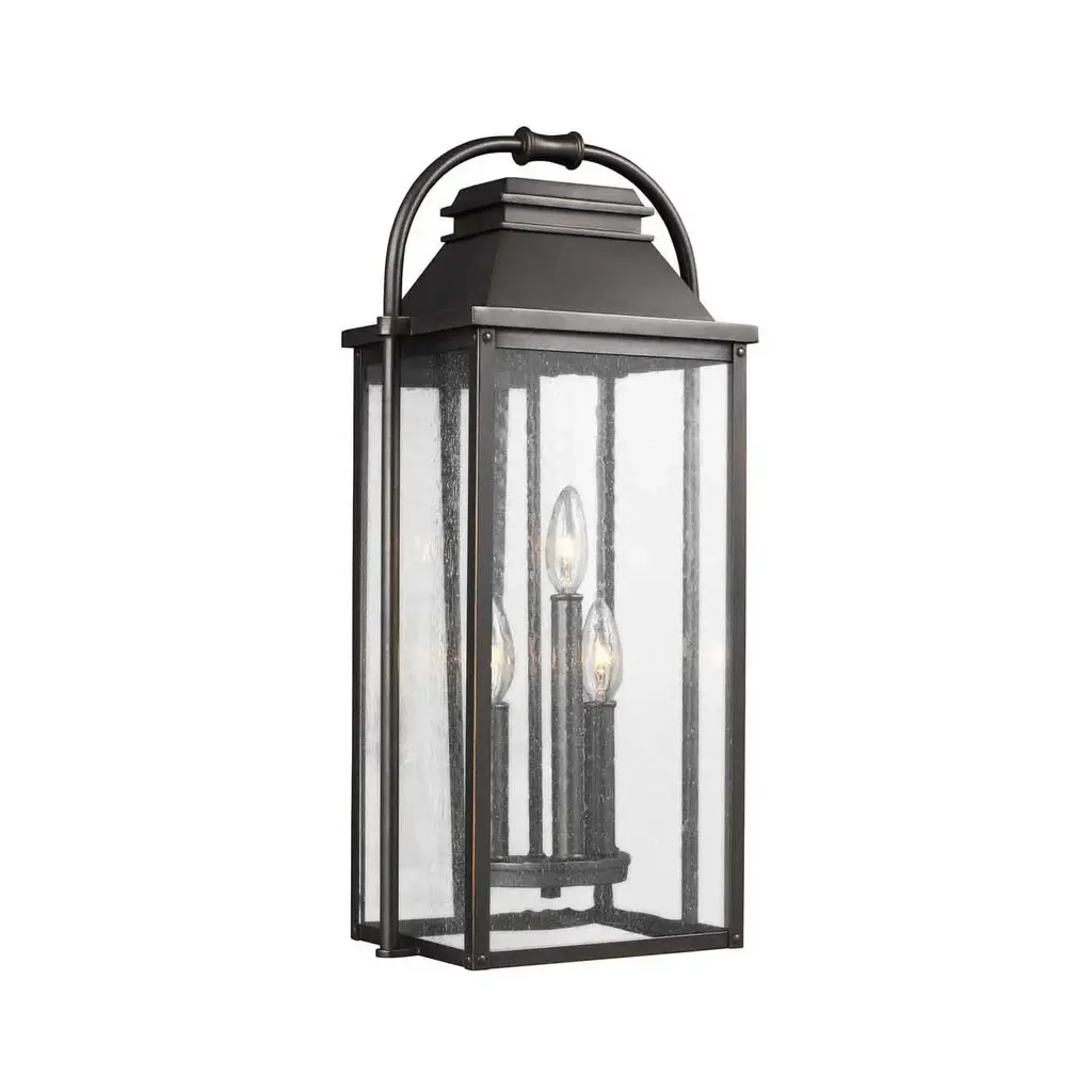 With its classic silhouette and sophisticated accents, the Sean Lavin Wellsworth Lantern from Visual Comfort & Co will add a touch of elegance to your entryway, porch, balcony or backyard. Crafted from cast aluminum and featuring a handle-like accent and clear seeded glass panels, its three candle structures produce a warm, diffused light that will illuminate any outdoor space. Make a statement and bring timeless style to your home. Highlights
