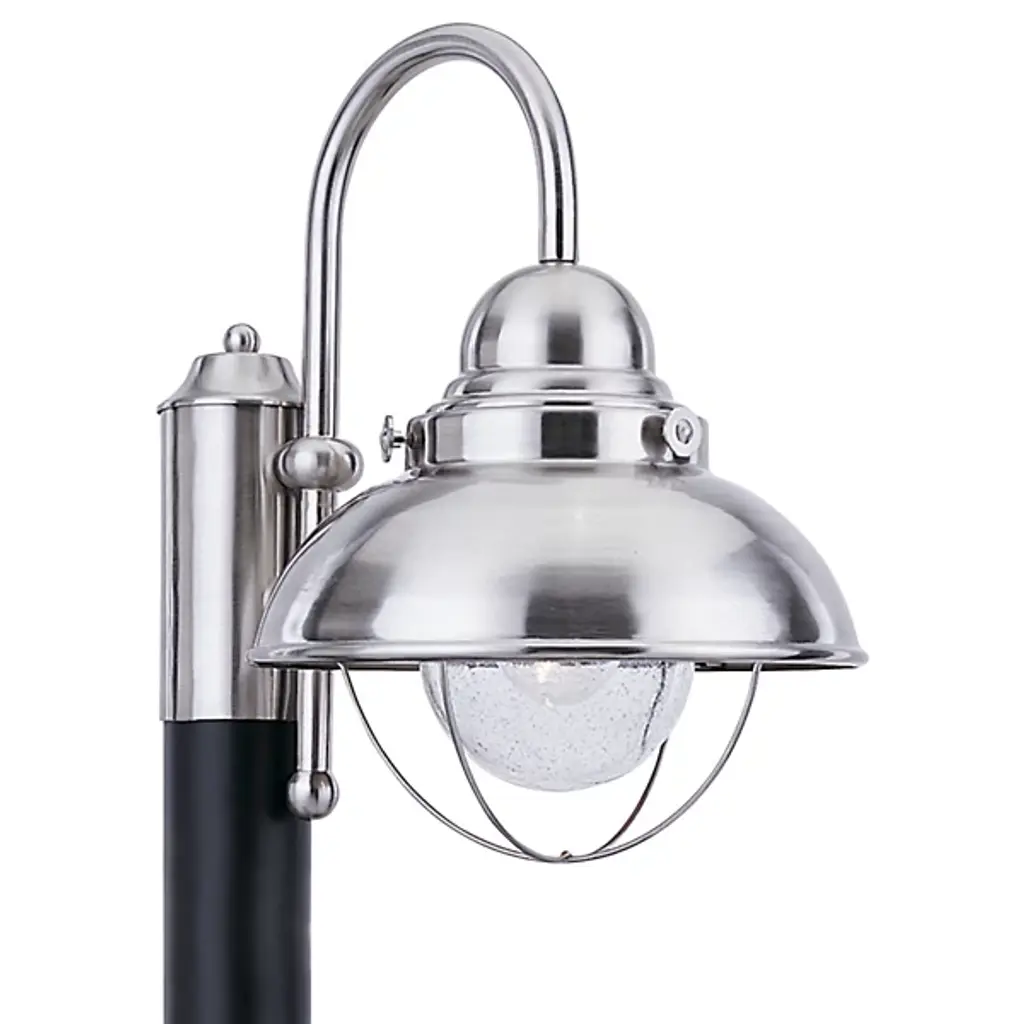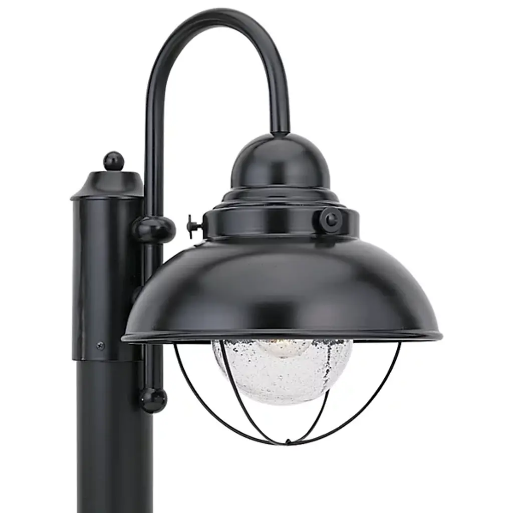 Turn your home into a seaside manor with the Sebring Outdoor Post Light by Generation Lighting, formerly known as Sea Gull Lighting, Its nautical-inspired body features a smooth metal body (available in different finishes) with charming knob accents and an open parabolic cage at its base. Within the cage, a Clear Seeded Glass shade diffuses light from an inner source, eliciting a warm, shimmering ambiance that makes you feel you’re right on the coast.