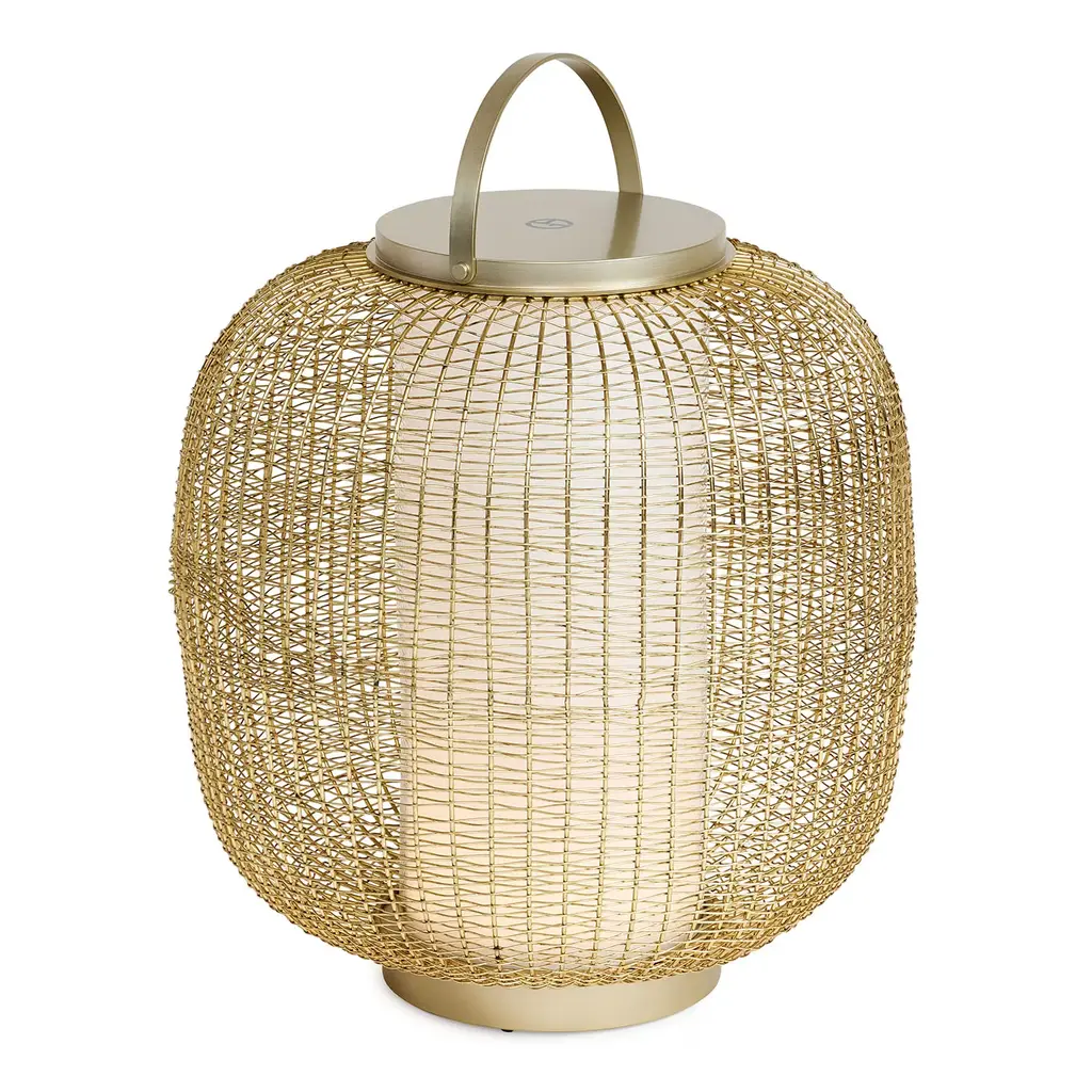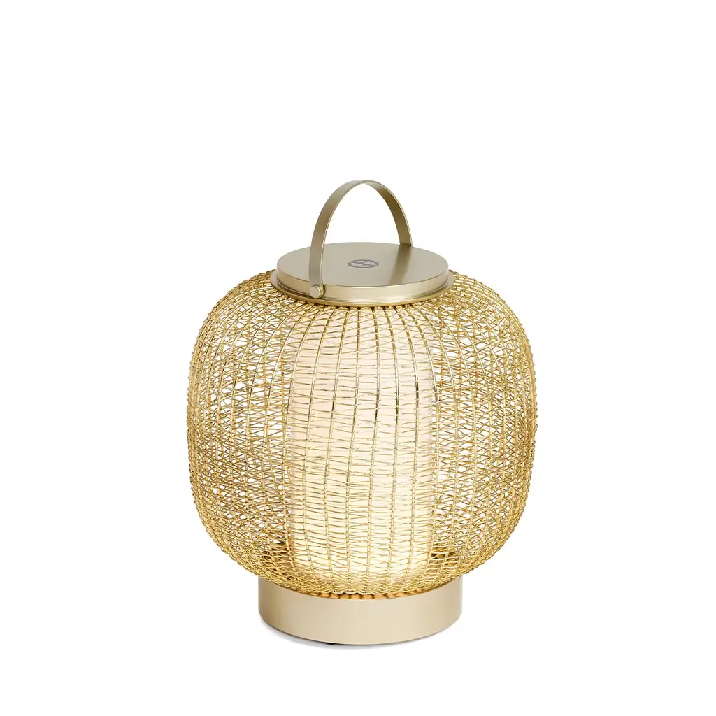 Trilly is a rechargeable lantern made with intertwined metal, available in two sizes. Both feature an upper handle to make them easier to move. The LED light source is contained in a cylinder in opaline methacrylate, which creates a more diffused effect. GA logo on the upper part. The switch is located below the base. Recharge time: 3 hours. Autonomy at maximum light: 8 hours. Small lanter measures 23x23x33h cm, large lantern measures 40x40x51h cm.