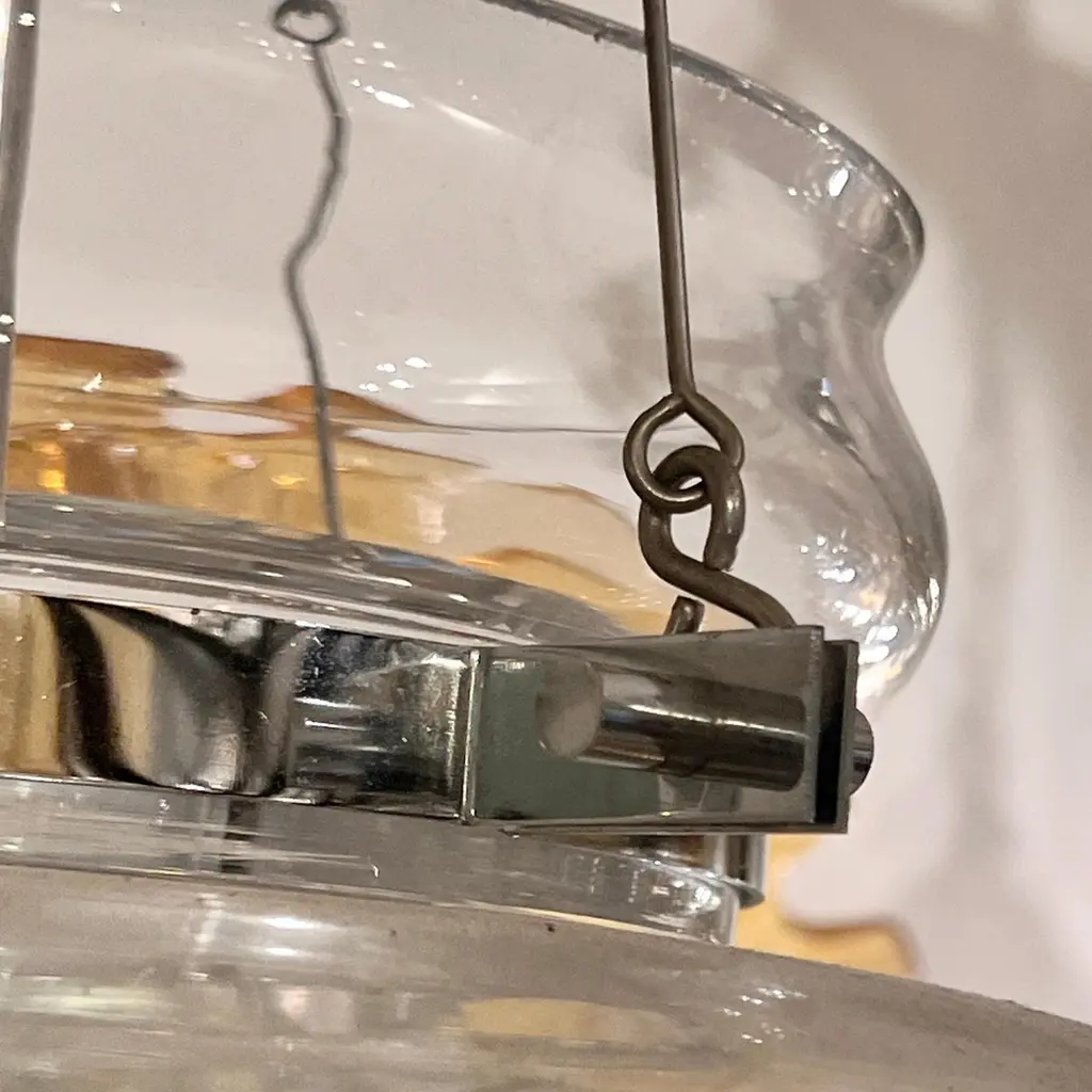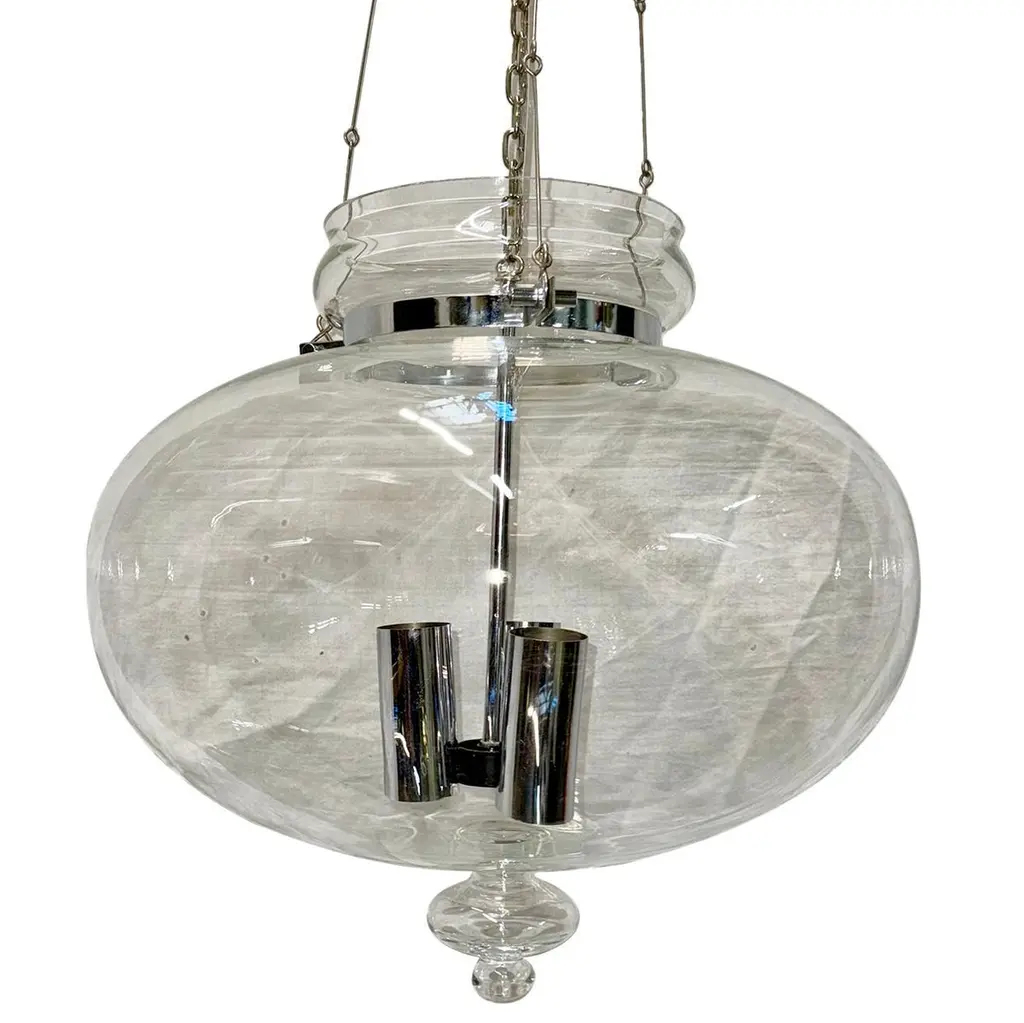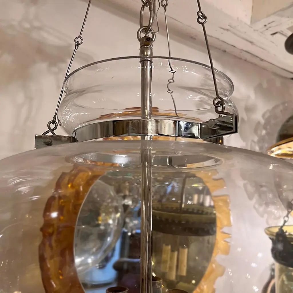 A circa 1970's Italian blown glass lantern with nickel plated body with 3 interior candelabra lights. Sold individually.Measurements:Present drop: 34" (adjustable)Min. drop: 23"Height of glass body: 15.75"Diameter: 16"