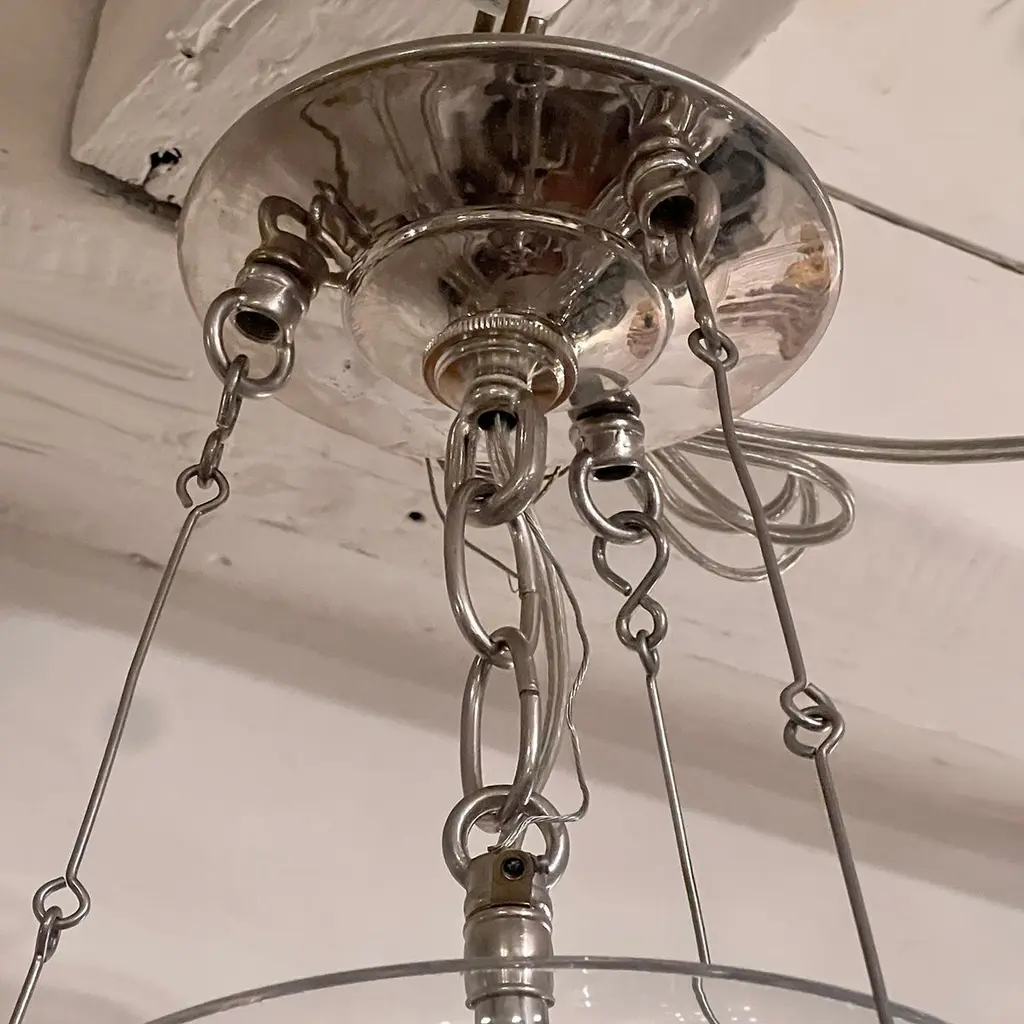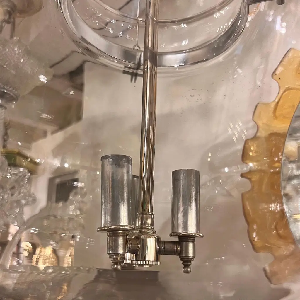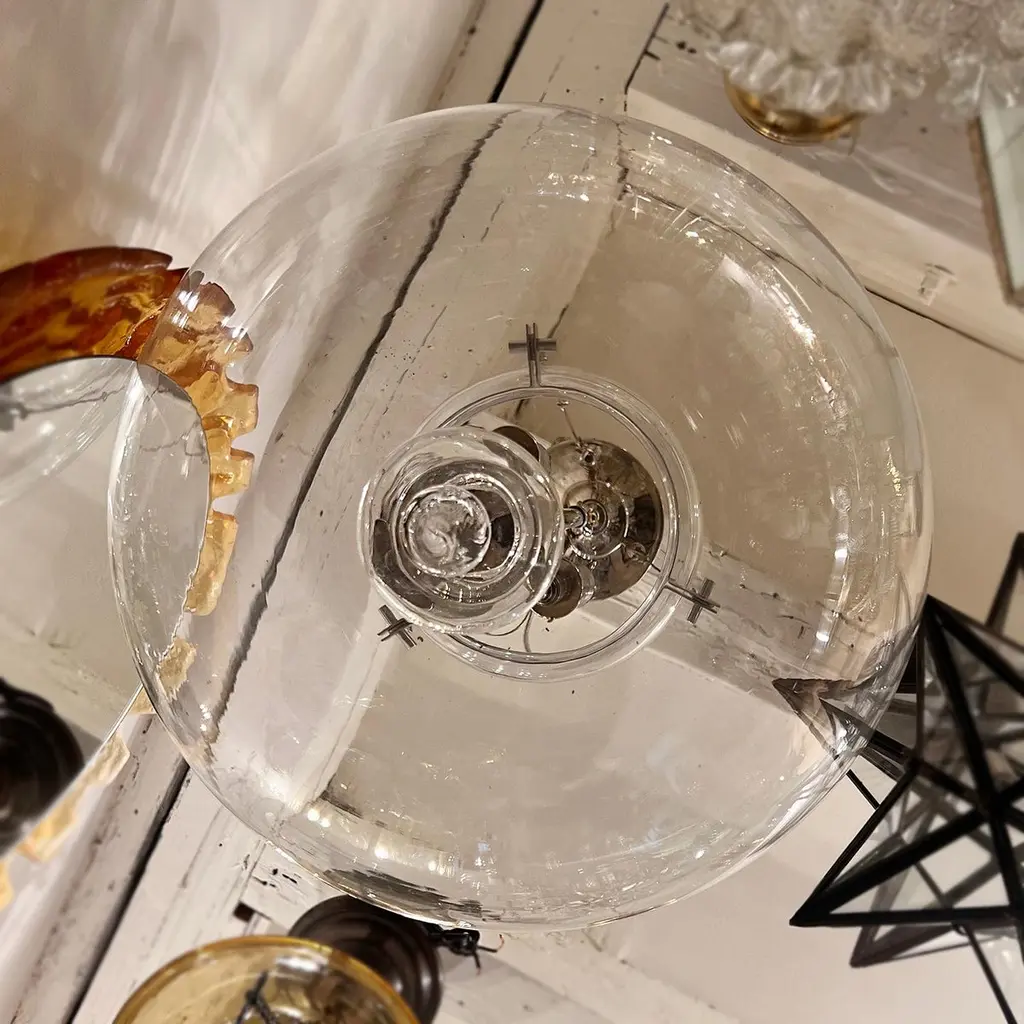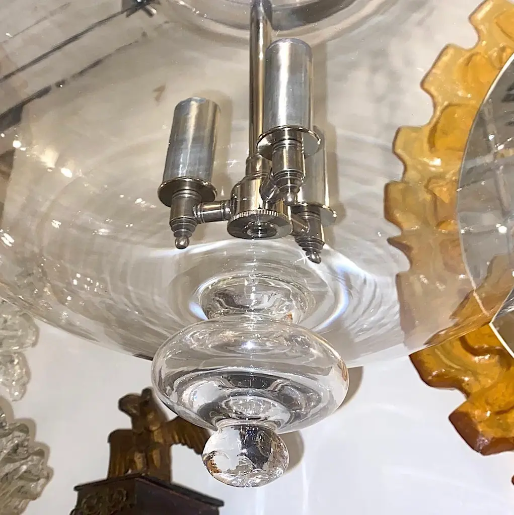 A circa 1970's Italian blown glass lantern with nickel plated body with 3 interior candelabra lights. Sold individually.Measurements:Present drop: 34" (adjustable)Min. drop: 23"Height of glass body: 15.75"Diameter: 16"