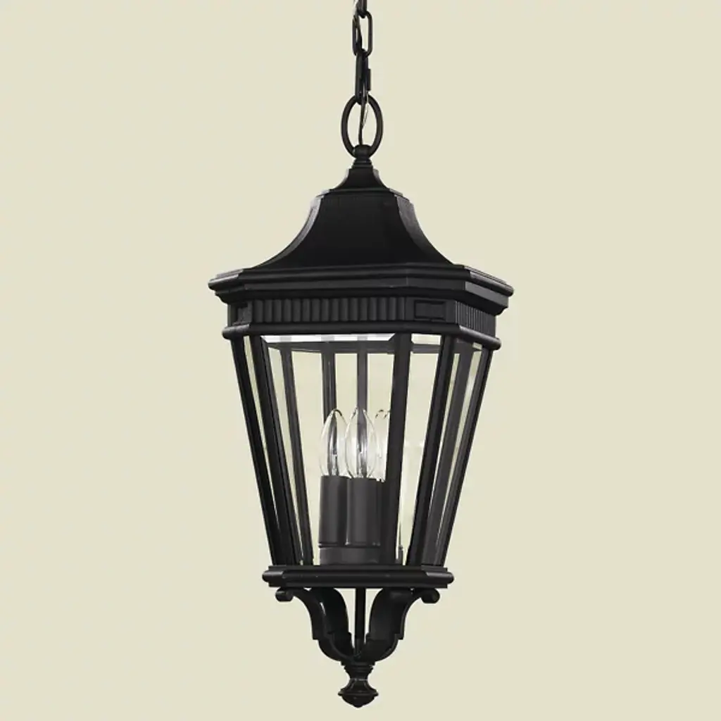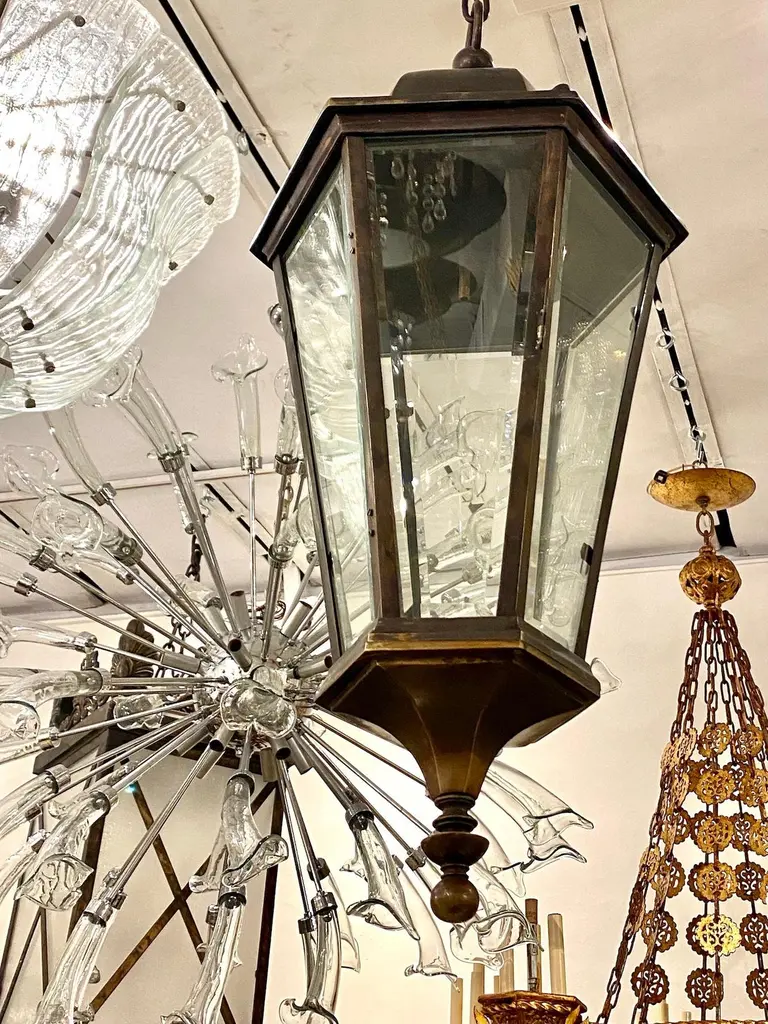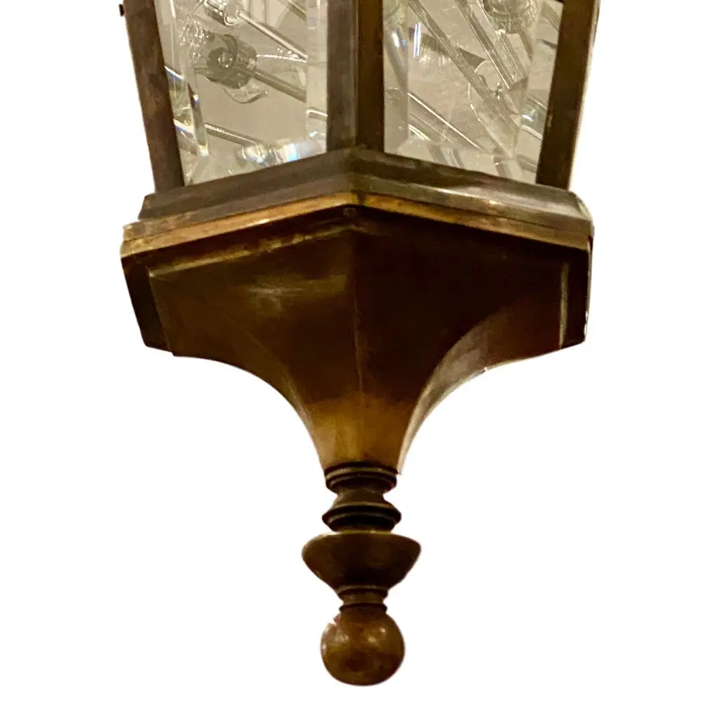 A set of eight circa 1940s English bronze outdoor pendant lantern with interior cluster of candelabra lights. Sold individually.Measurements:Height 36"Diameter 16"