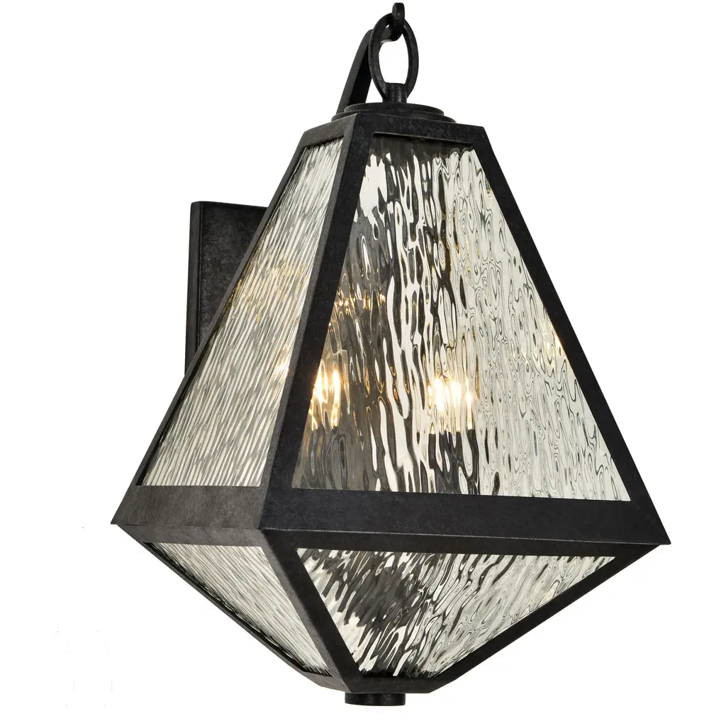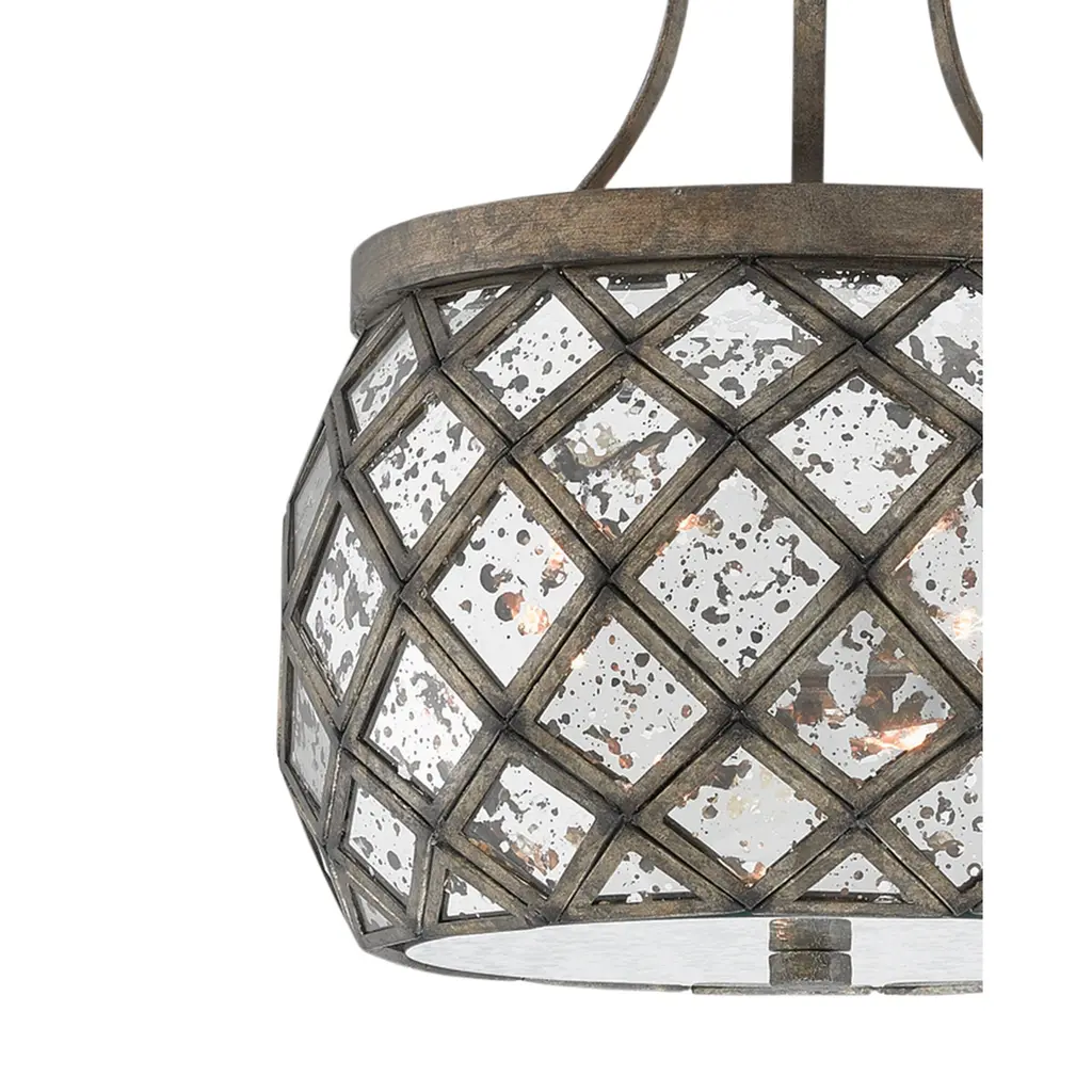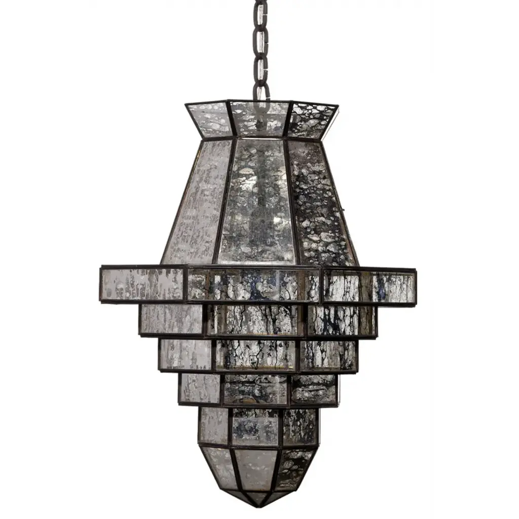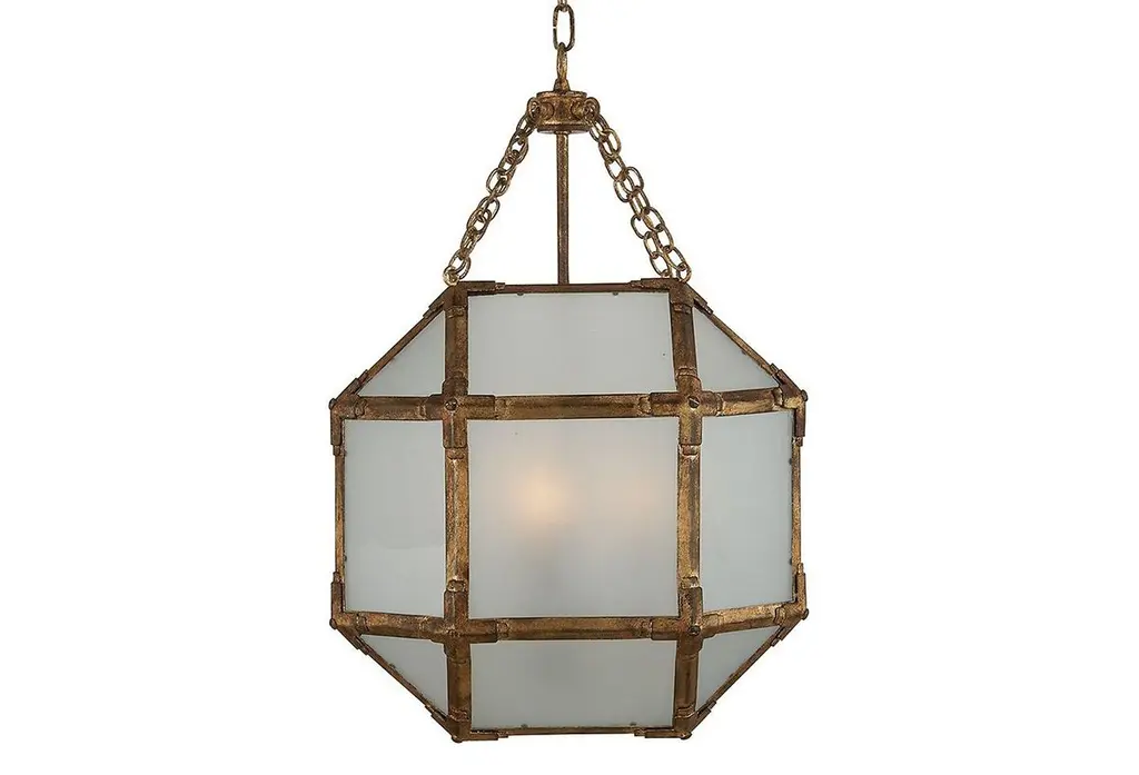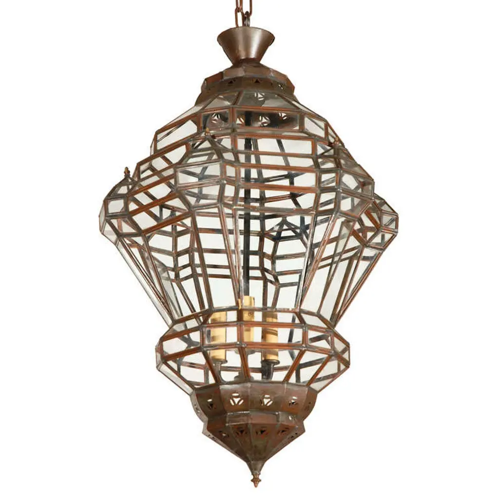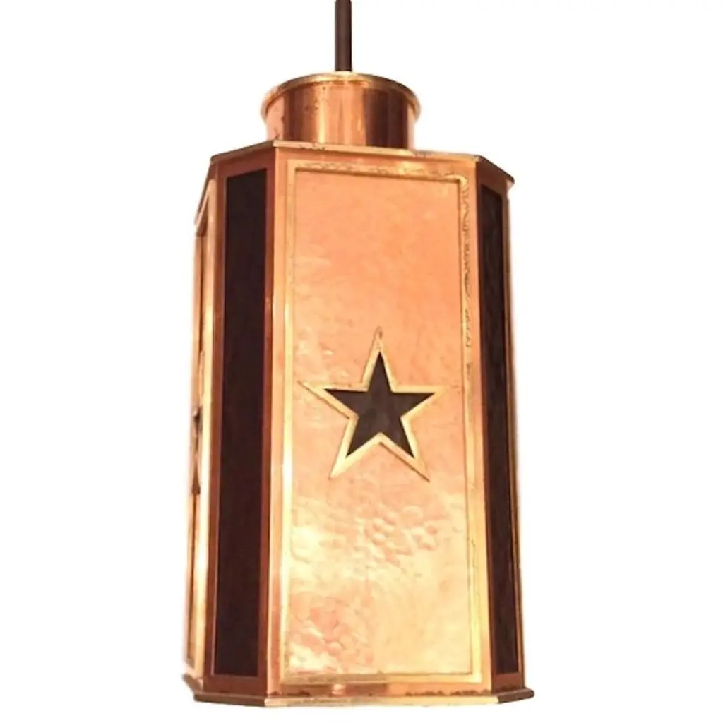 A set of eight octagonal copper lanterns with amber mica corner insets with interior up and down interior lights. Sold individually.Measurements:Minimum drop 16"Width/length 9.5" square.