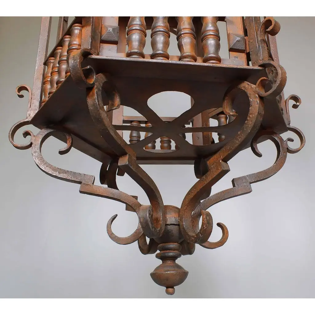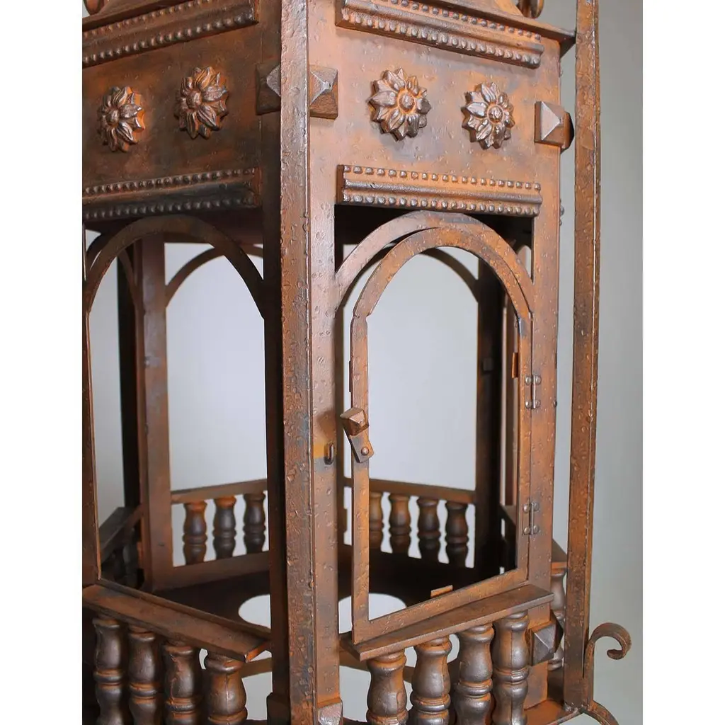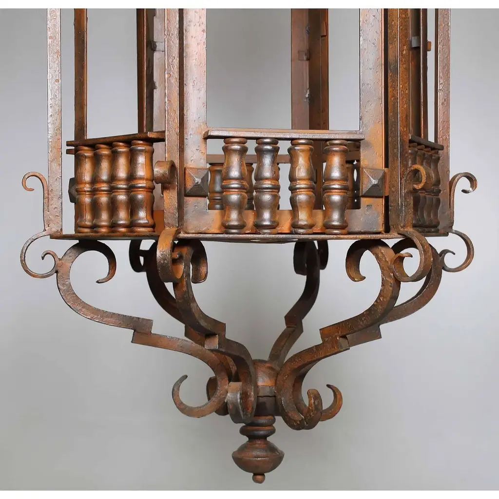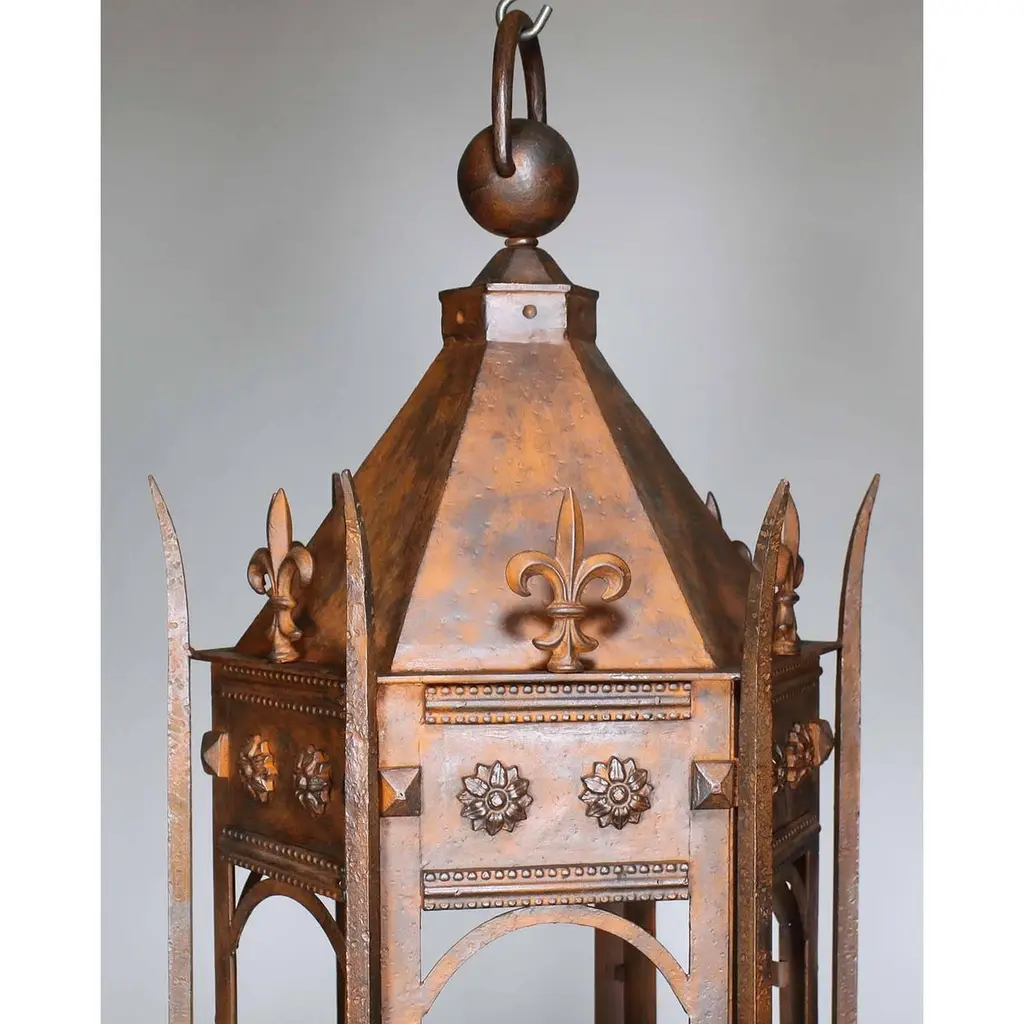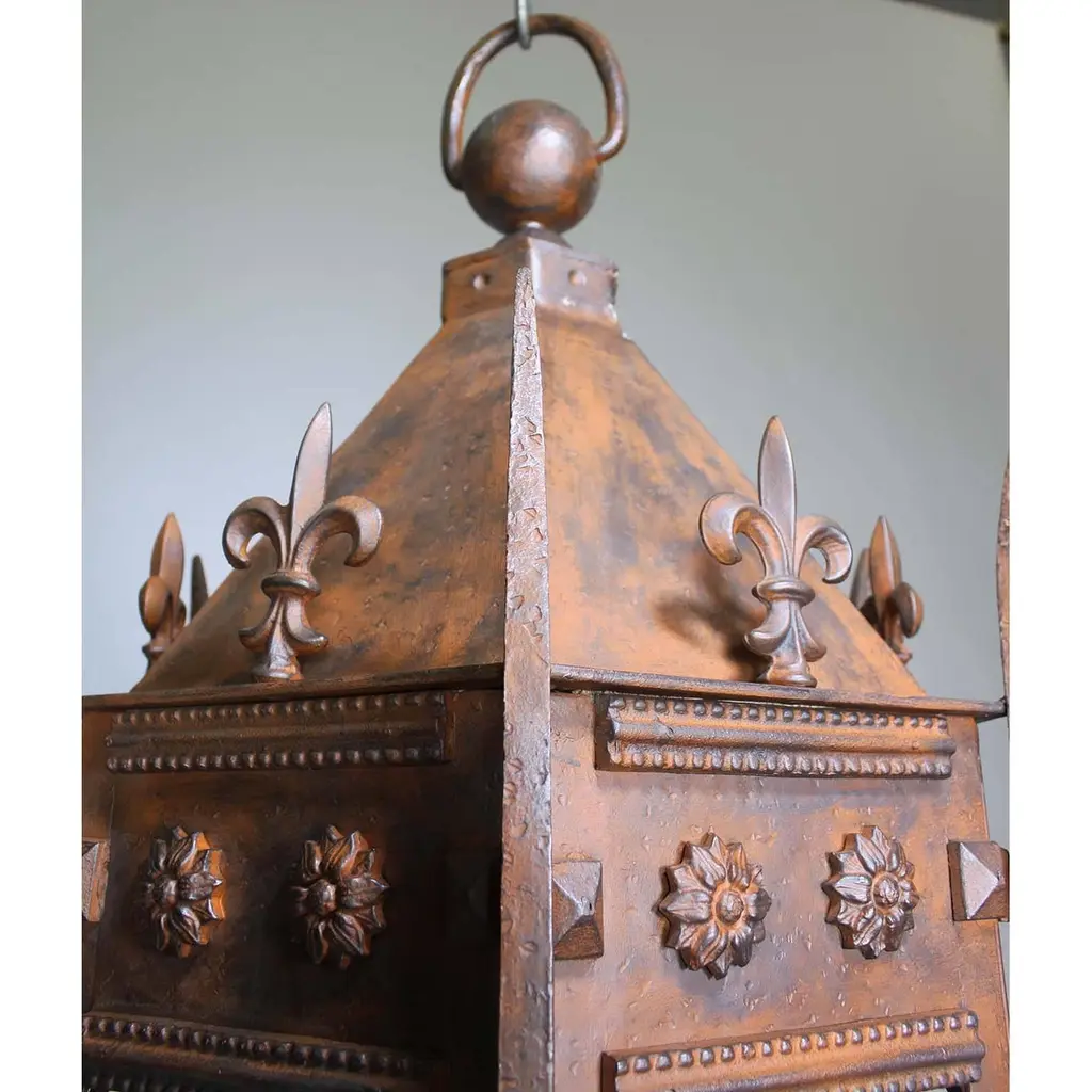 A set of four hexagonal French Louis XV style wrought iron hanging lanterns, after the antique. The elongated body surmounted with fleur-de-lis', floral rosettes and scrolled decorative elements, in a rusted brick finish, circa late 20th century. Measures: Height 51 7/8 inches (131.8 cm)Width 22 3/4 inches (57.8 cm).