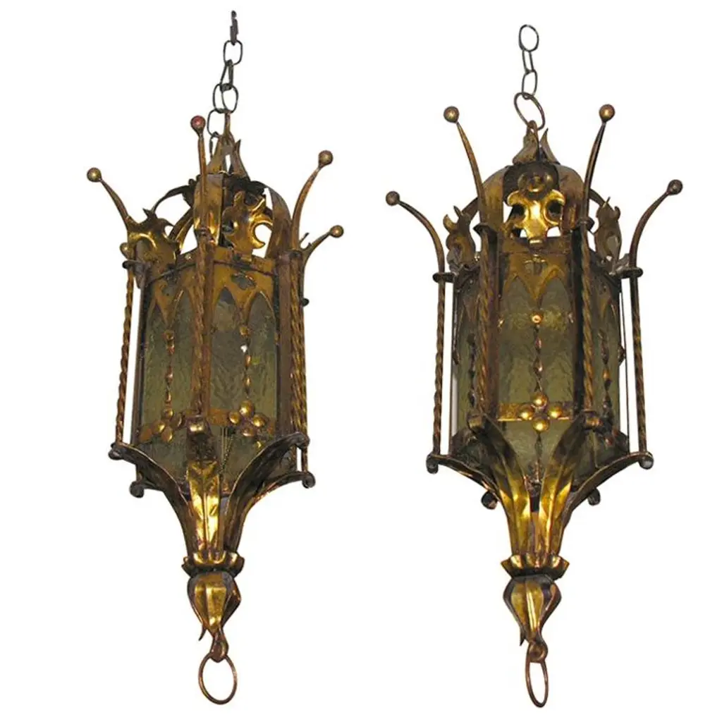 Set Of Four Hexagonal French Louis Xv Style Wrought Iron Hanging Lanterns