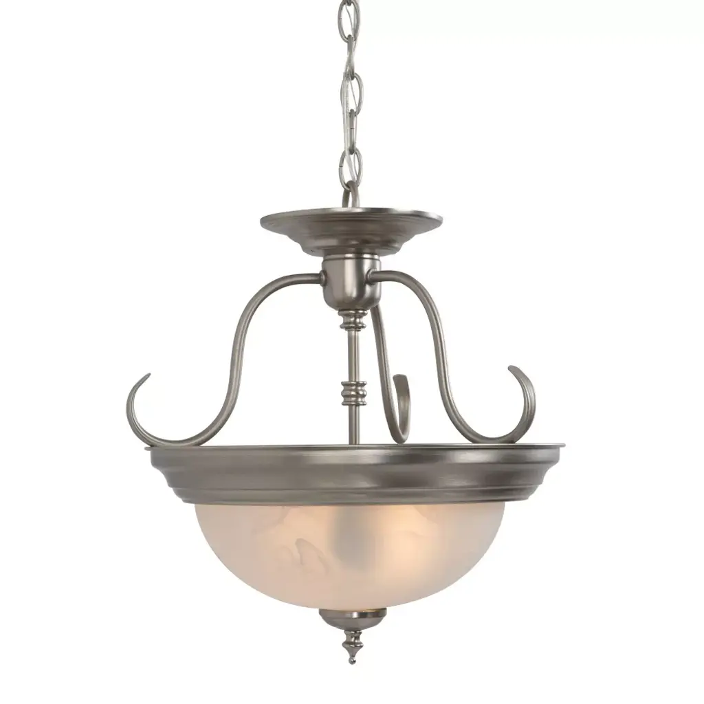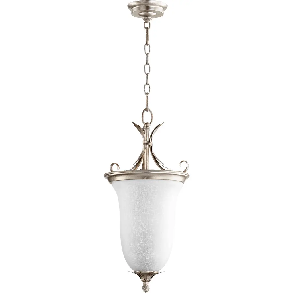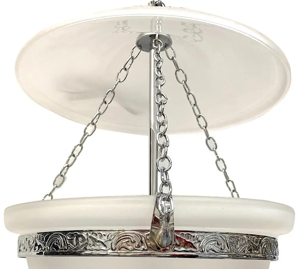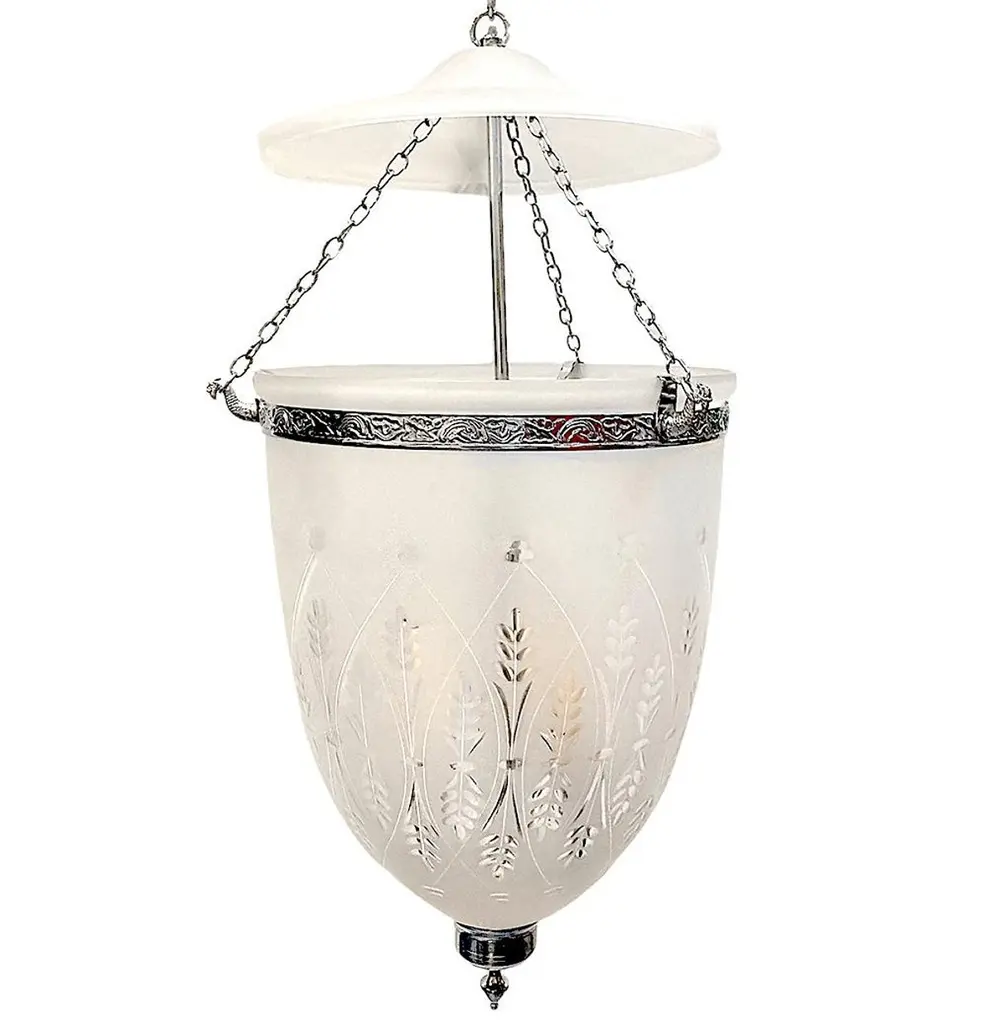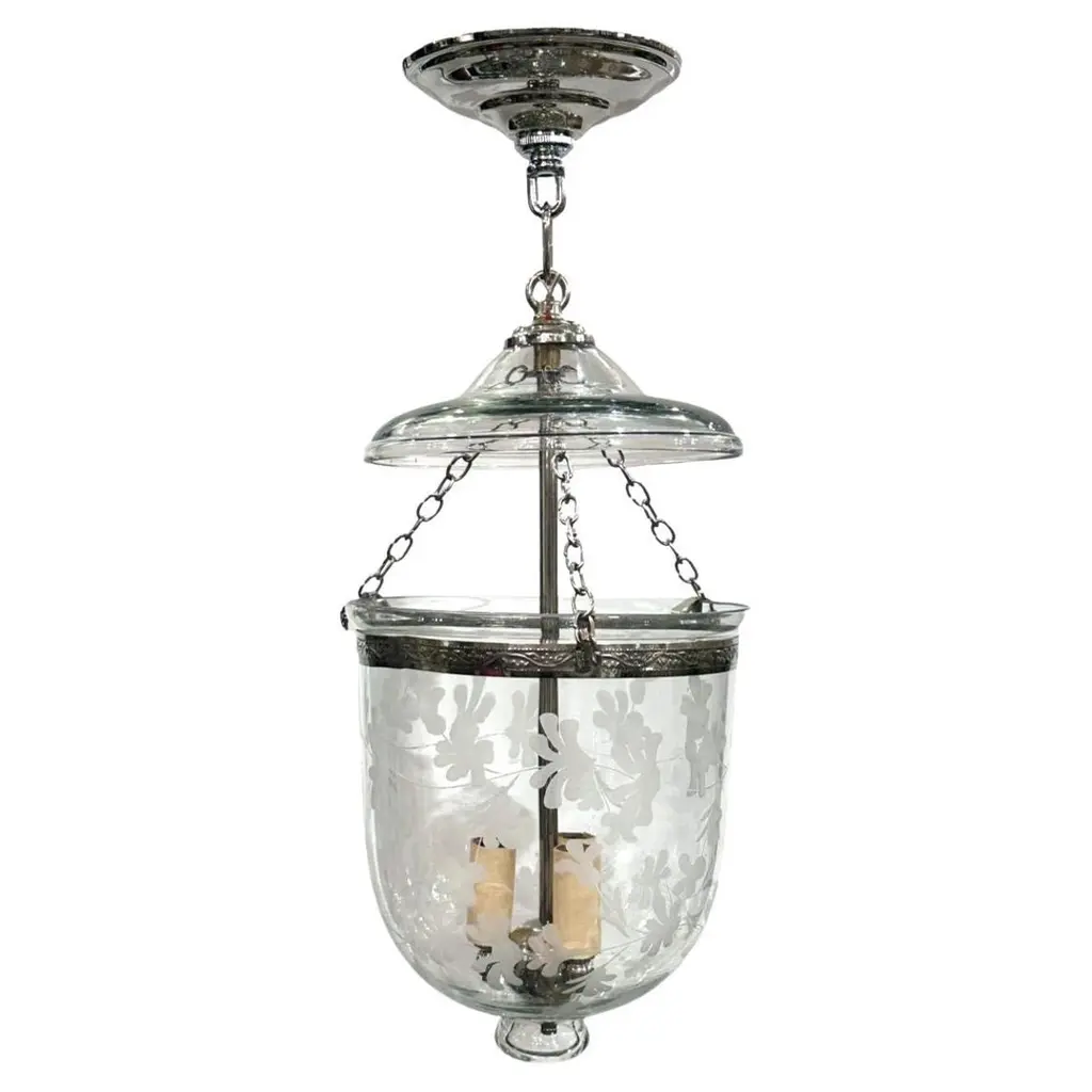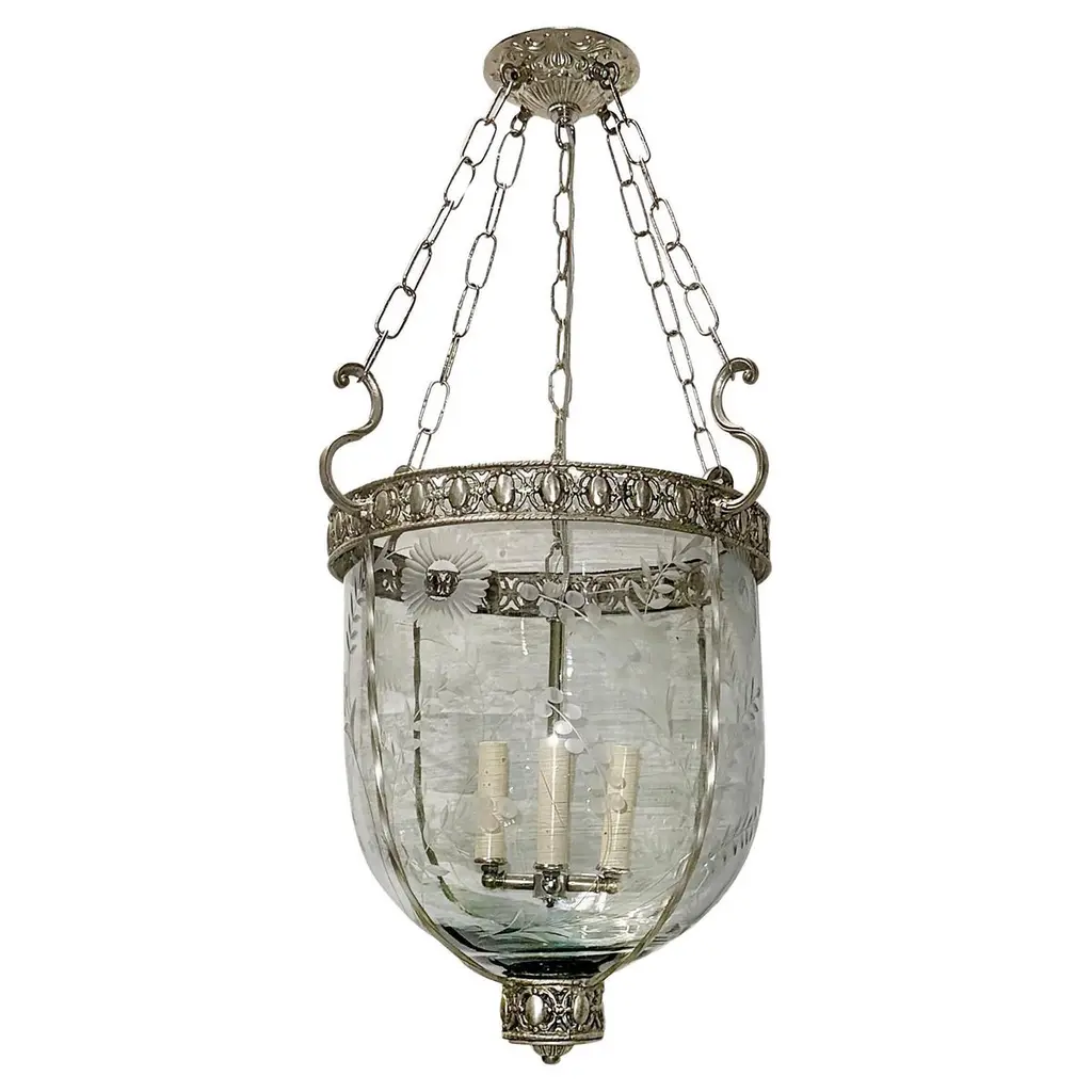 A set of five Italian etched glass lanterns with nickel plated fitting and three interior lights. Sold Individually.Measurements:Diameter 14"Minimum drop 27".