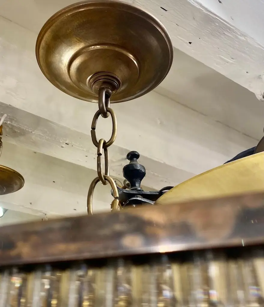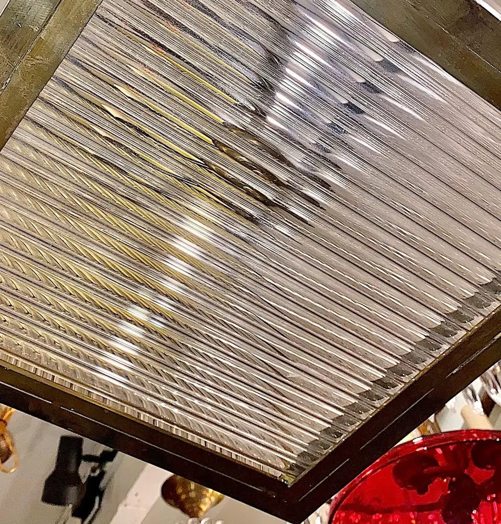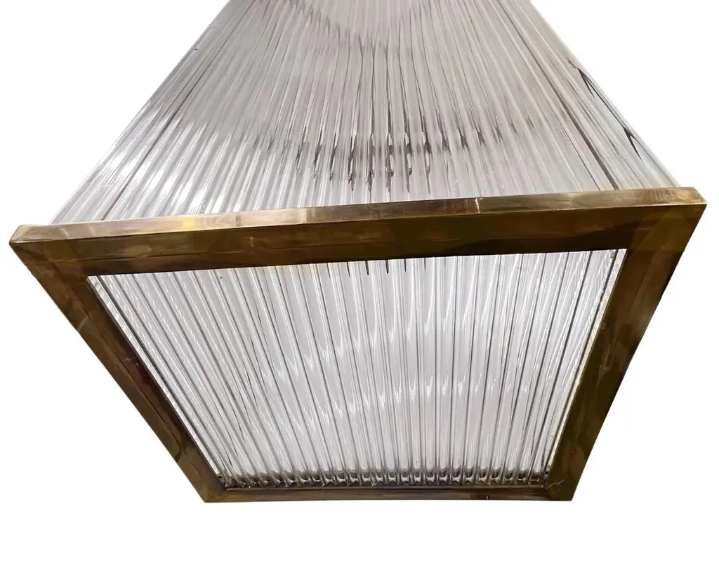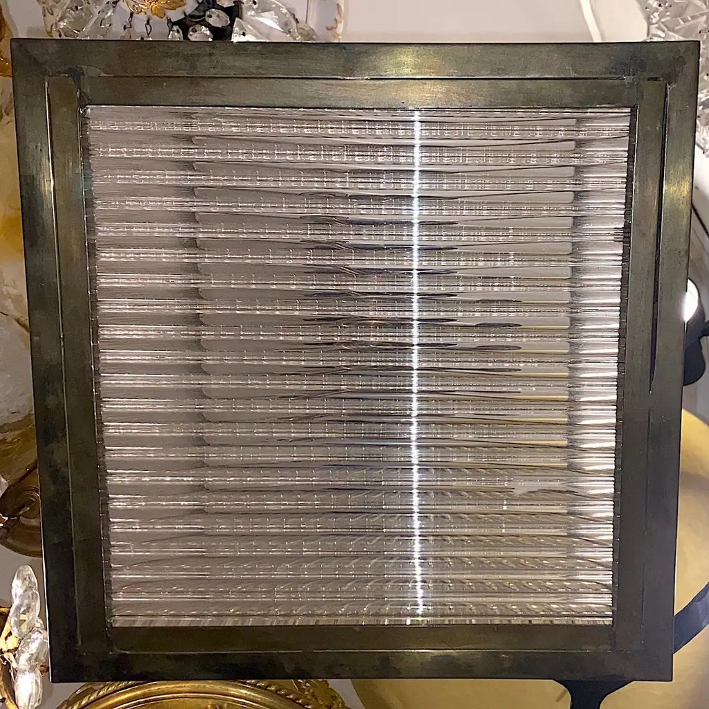 A set of four Italian circa 1950’s bronze lanterns with glass rods insets in body. Sold individually.Measurements:Height of body: 24.5"Width and depth: 14 (square).