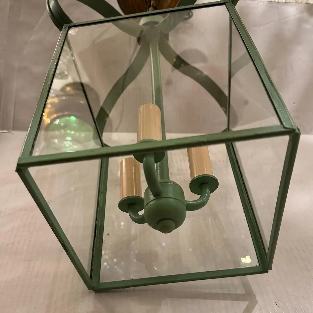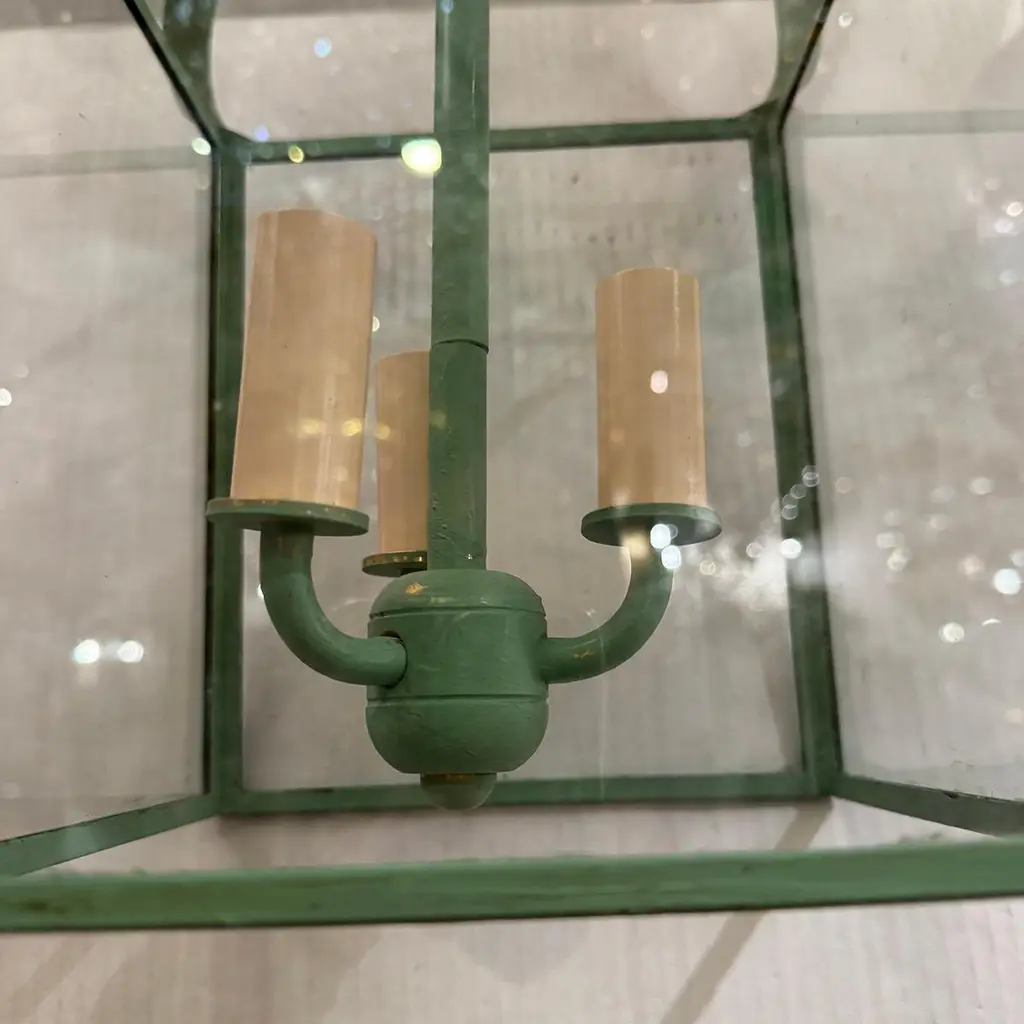 A set of 6 vintage Italian painted tole lanterns with 3 interior candelabra lights.Measurements:Drop: 21"Diameter: 9.5" square