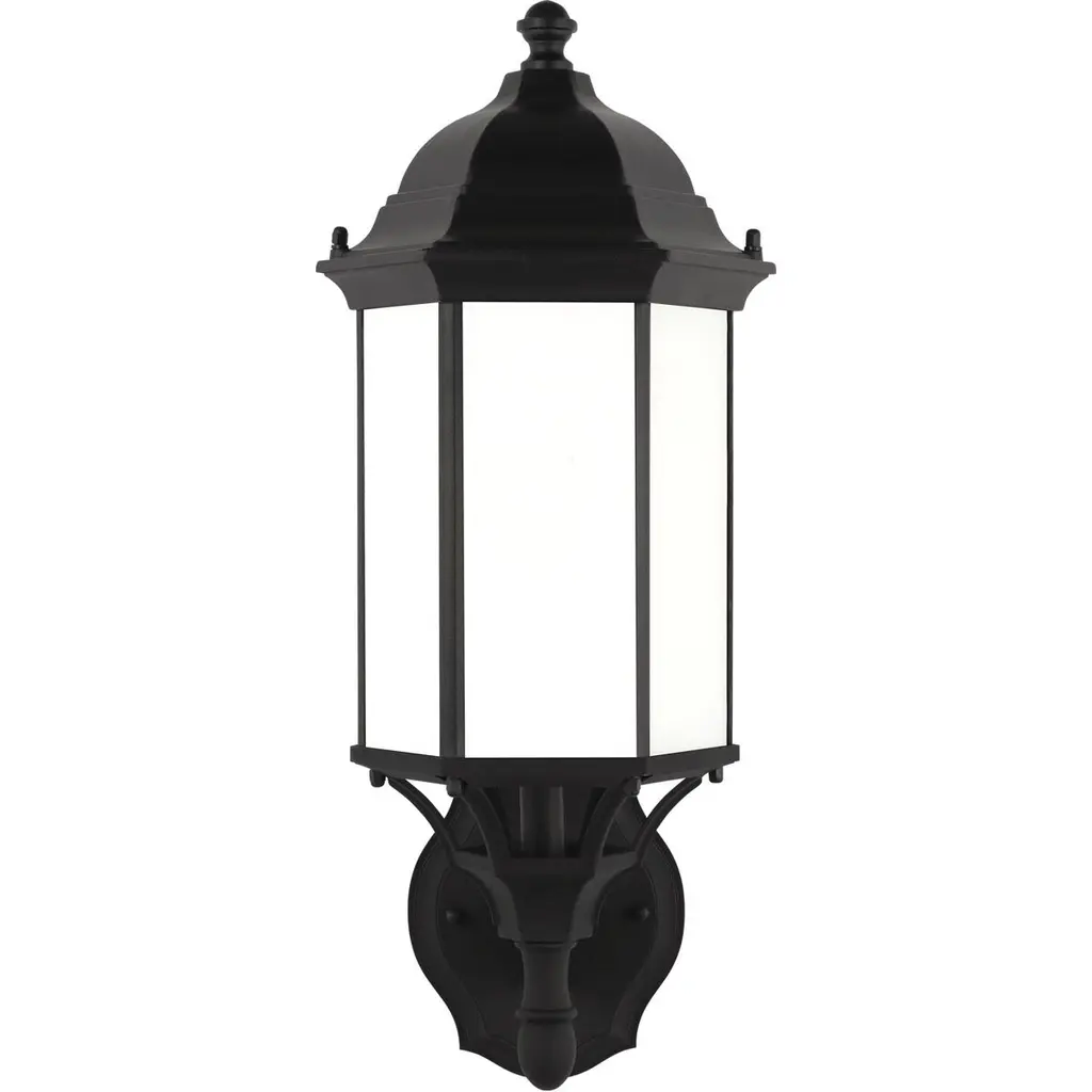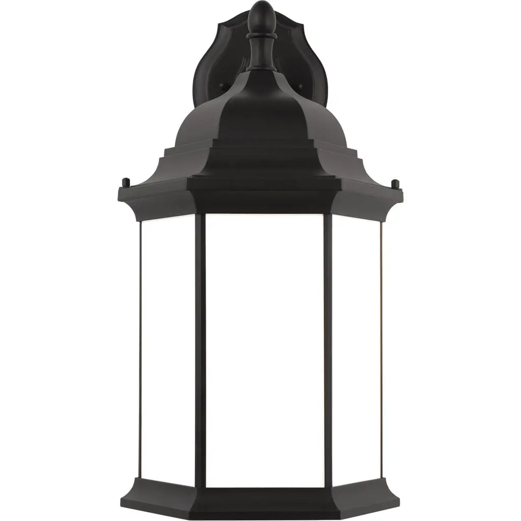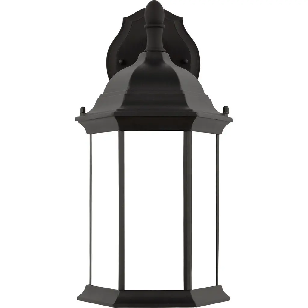 The Sevier one light outdoor wall fixture in black is an ENERGY STAR½ qualified lighting fixture that uses LED bulbs to save you both time and money. The Sevier outdoor collection by brings timeless design to new heights with its traditional design details found in classic outdoor fixtures as well as an open bottom for easy maintenance. Made of durable cast aluminum, a multi-level crown, top finial and stepped-edge back plate complete the traditional look. Offered in Antique Bronze or Black finish, both with Clear glass, the collection includes a one-light outdoor pendant, one-light post lantern, a large one-light up light outdoor wall lantern, a small one-light up light outdoor wall lantern, a small one-light downlight outdoor wall lantern, and a large one-light downlight outdoor wall lantern.