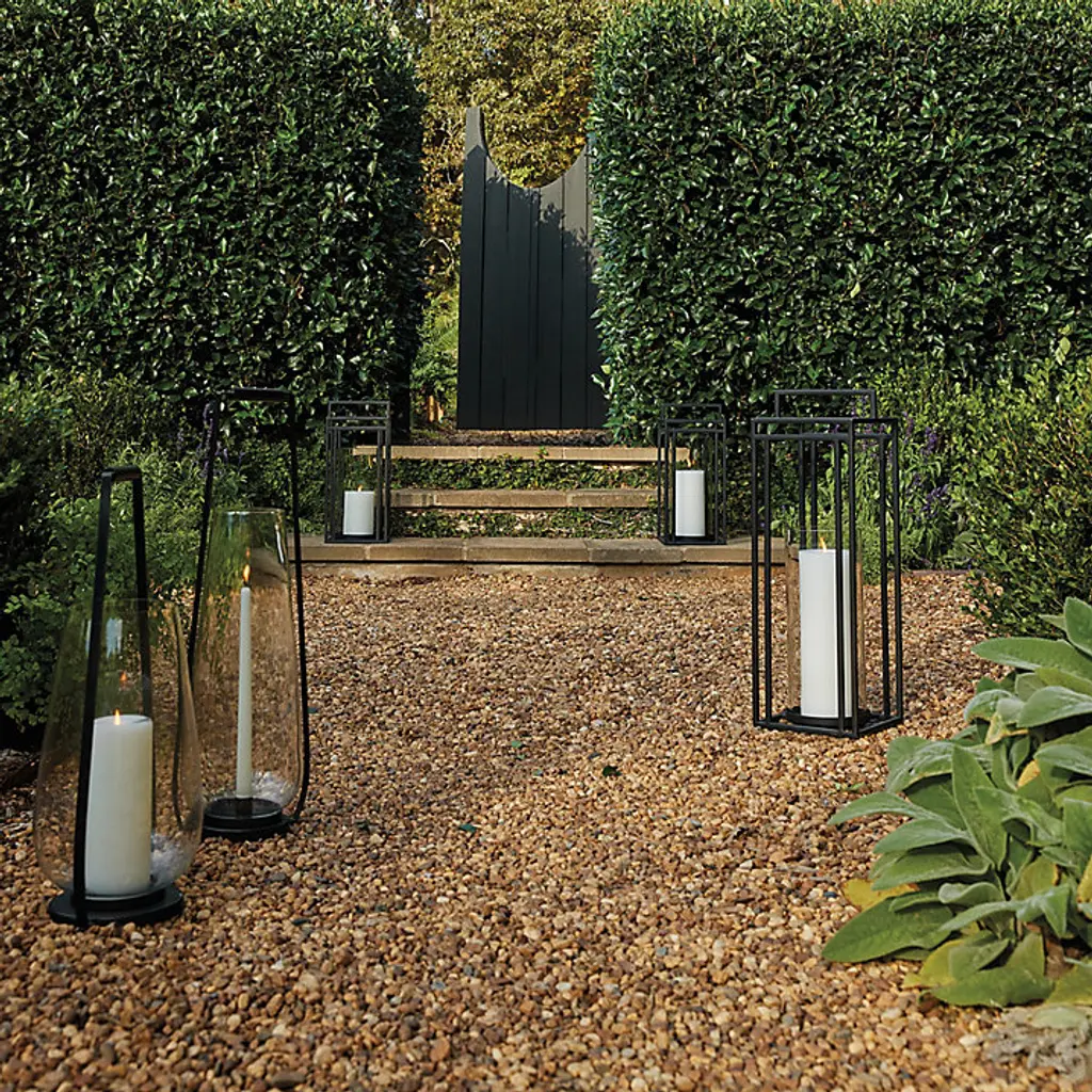 A contemporary take on the traditional candle lantern. Our Sheridan Lantern's clean-lined frame is handmade of iron with twisted handle details and matte black finish. The beautifully shaped hurricane is made of clear glass and lift-offs for easy candle placement and cleaning. A built-in lip keeps the hurricane glass in place. Small size holds a pillar candle; Large size fits a taper candle. Use several to illuminate outdoor steps while you entertain or to illuminate a garden path. We also love this candle holder indoors to add candlelit romance in the dining room or living room. Sheridan Lantern features: