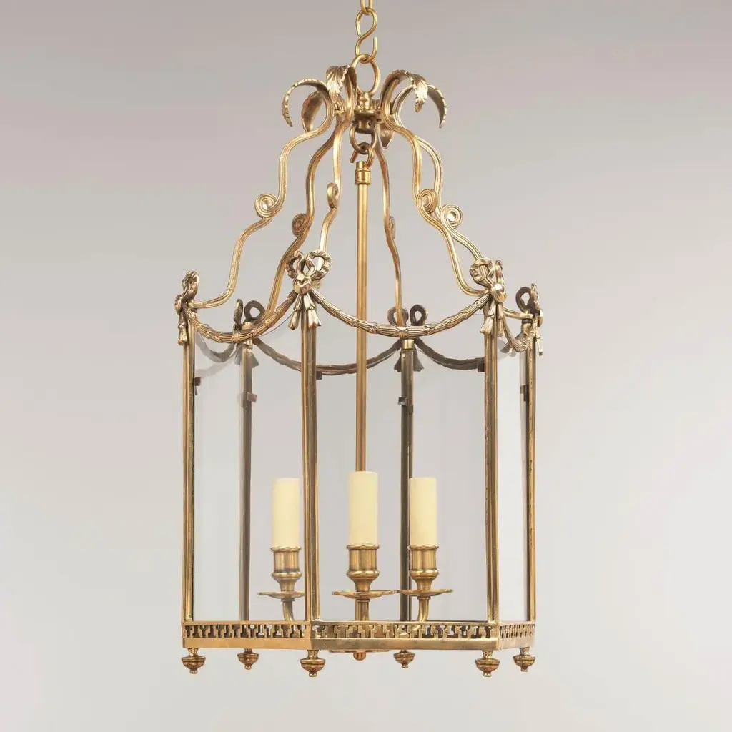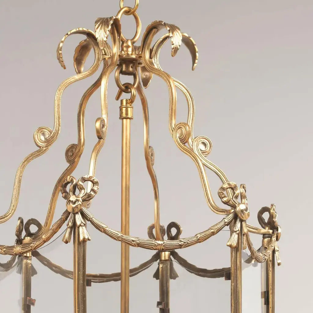Neo-Classic style five-light brass hall lantern with 18th-century style embellishments. The leaf tip crown above scrolling supports and a hexagonal frame decorated with bowknots, tassels, and bellflower swags. The base is decorated with a pierced Greek key gallery and drop finials. Dimensions: 13.75" W x 12" D x 23" H Supplied with 39” of chain.