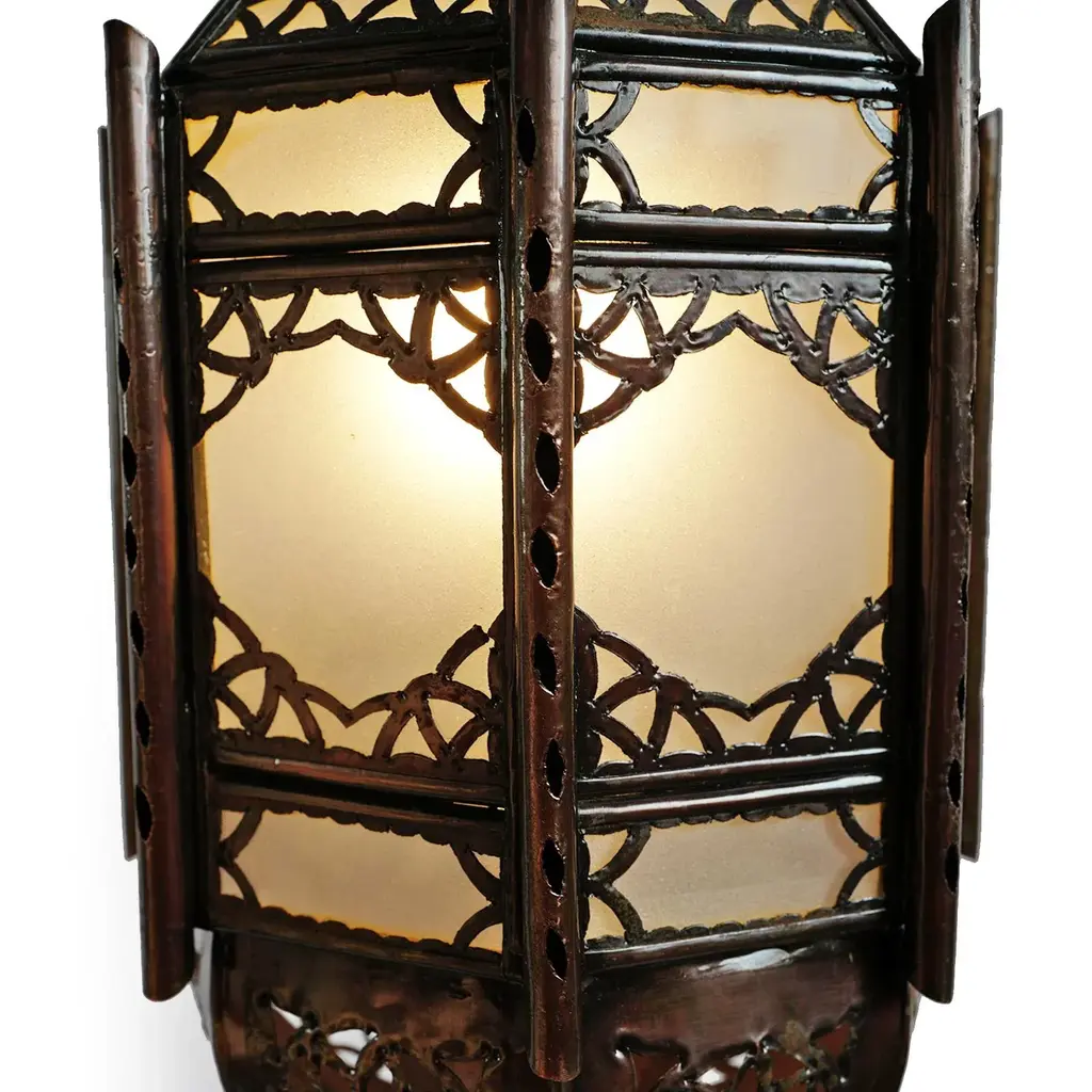 Beautiful vintage Moroccan small tin cut patterns with dark bronze metal and white frosted glass. Each may have slight variations in exact finish and handmade details. Comes with three feet of black chain and a ceiling plate. 100 watt max fixture. Bulb not included.