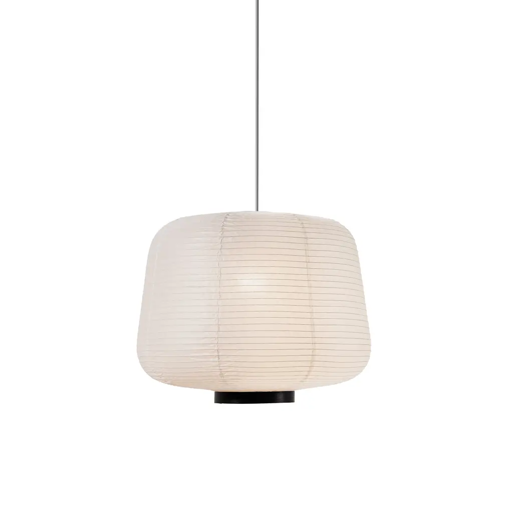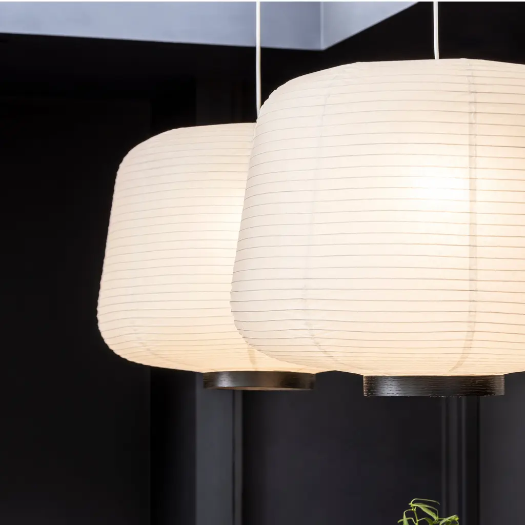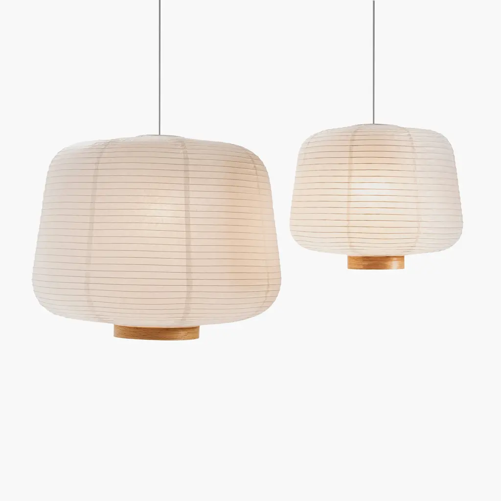 Handcrafted from rice paper, it emits a soft, diffused light, creating a warm and inviting atmosphere. Inspired by traditional Asian lanterns, blending them with a modern design. This design mirrors the rounded conic shades of the Soft lighting collection, offering a contemporary yet timeless appeal. Available with a natural oak or black wood accent at the opening of the lantern.