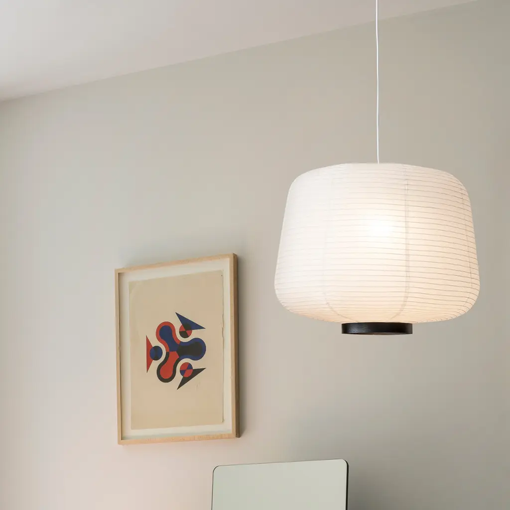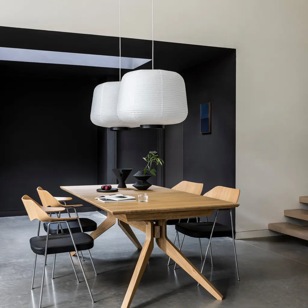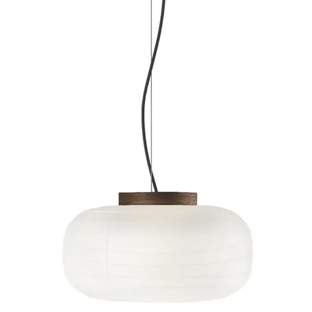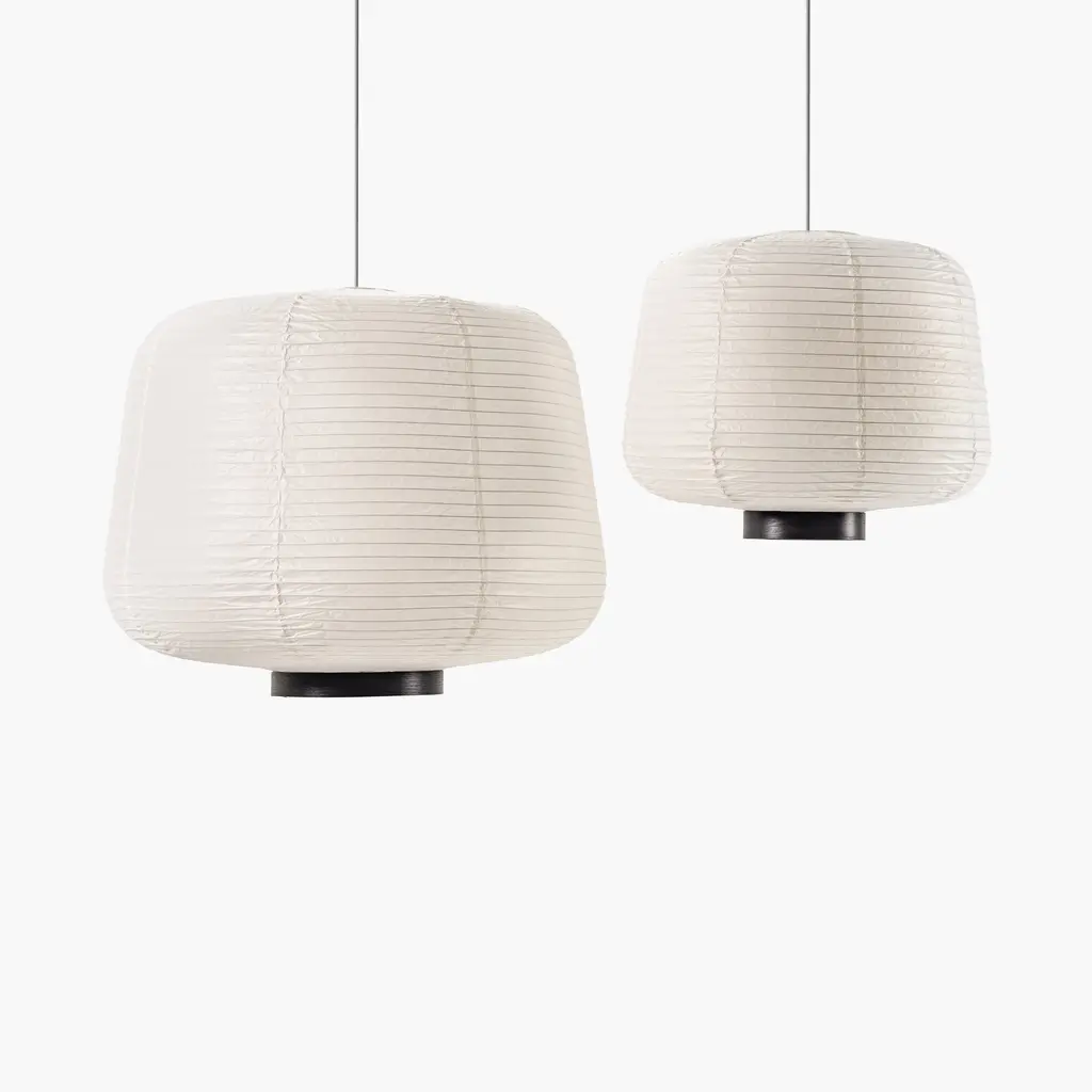 Handcrafted from rice paper, it emits a soft, diffused light, creating a warm and inviting atmosphere. Inspired by traditional Asian lanterns, blending them with a modern design. This design mirrors the rounded conic shades of the Soft lighting collection, offering a contemporary yet timeless appeal. Available with a natural oak or black wood accent at the opening of the lantern.