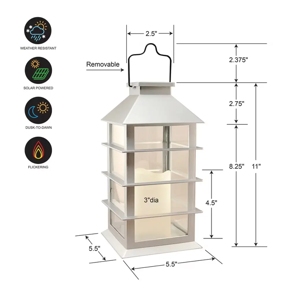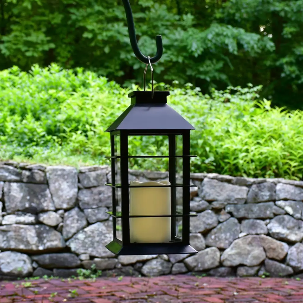 Charged by the sun, this classic solar-powered lantern will highlight the look of your outdoor décor from dusk until dawn. The flickering amber LED candle adds a warm glow of illumination. This lantern can be placed anywhere outdoors without extension cords. The sturdy plastic and glass construction makes this lantern perfect for the outdoor elements. Keep lantern in a sunny area every day to charge the panel for nighttime illumination. With a handle, this lantern can hang from a shepherd’s hook and be displayed along a walkway.
