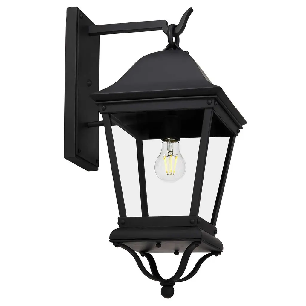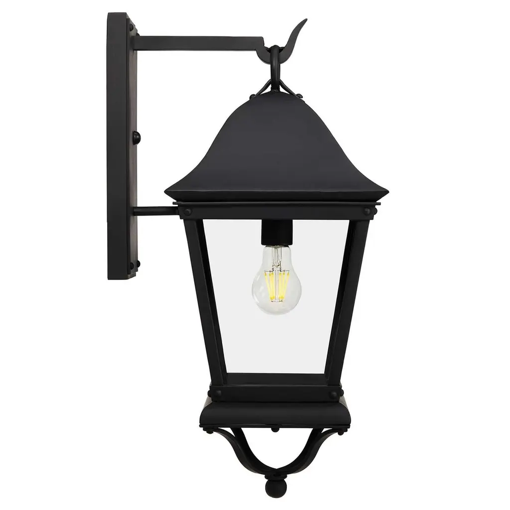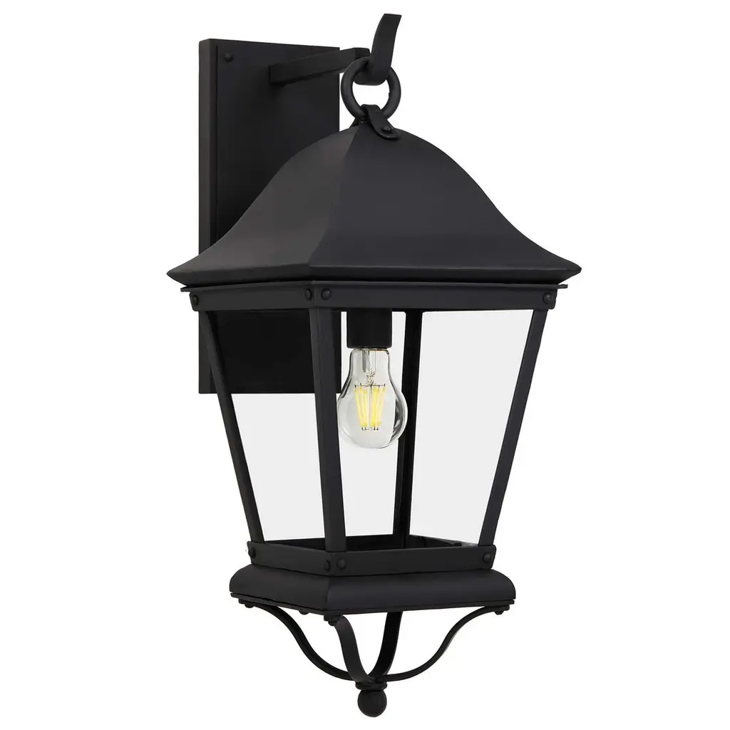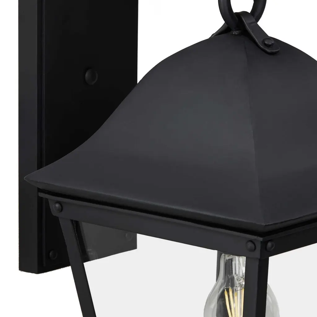 This classic lantern features a tapered profile, bell-curved lid, and an elemental aesthetic. Open glass panels and rivet detailing lend a modern twist to a classic lantern style. Suitable for an array of settings.Backplate Dimensions (inches): 5W x 9HLantern shown in SBLC Grey Finish with SBLC Clear Glass. Hand-forged in heavy gauge wrought iron. All lanterns go through a metalizing process, a protective zinc layer added to ensure protection and durability against corrosion and harsh weather conditions.All lights are handmade and made to order. Dimensions may vary slightly.All lights ship with 5w LED Edison dimmable filament bulb.This lantern will ship within 8-10 weeks. Larger orders may have longer lead times. As with any handcrafted product, slight discrepancies are inherent in the art of forged iron, and even considered desirable as they indicate our old-world craftsmanship. Natural variations in tone, texture, and color may occur as our finishes are hand painted.
