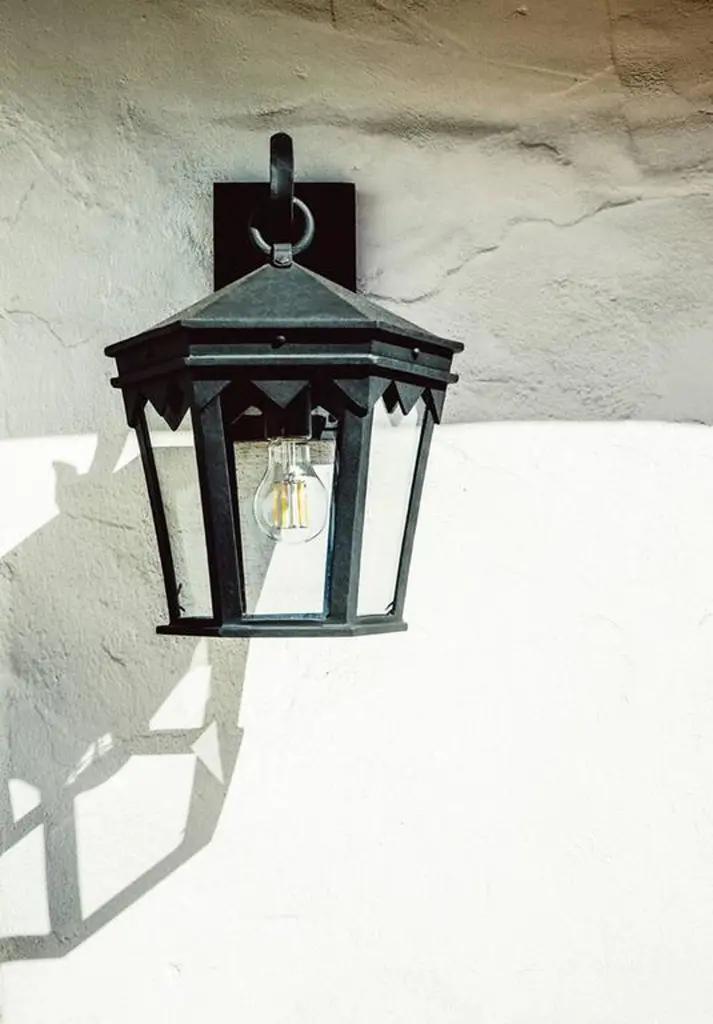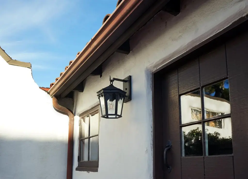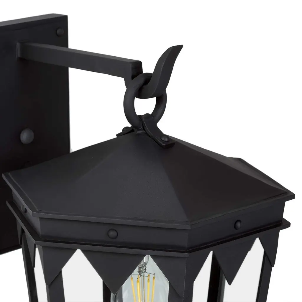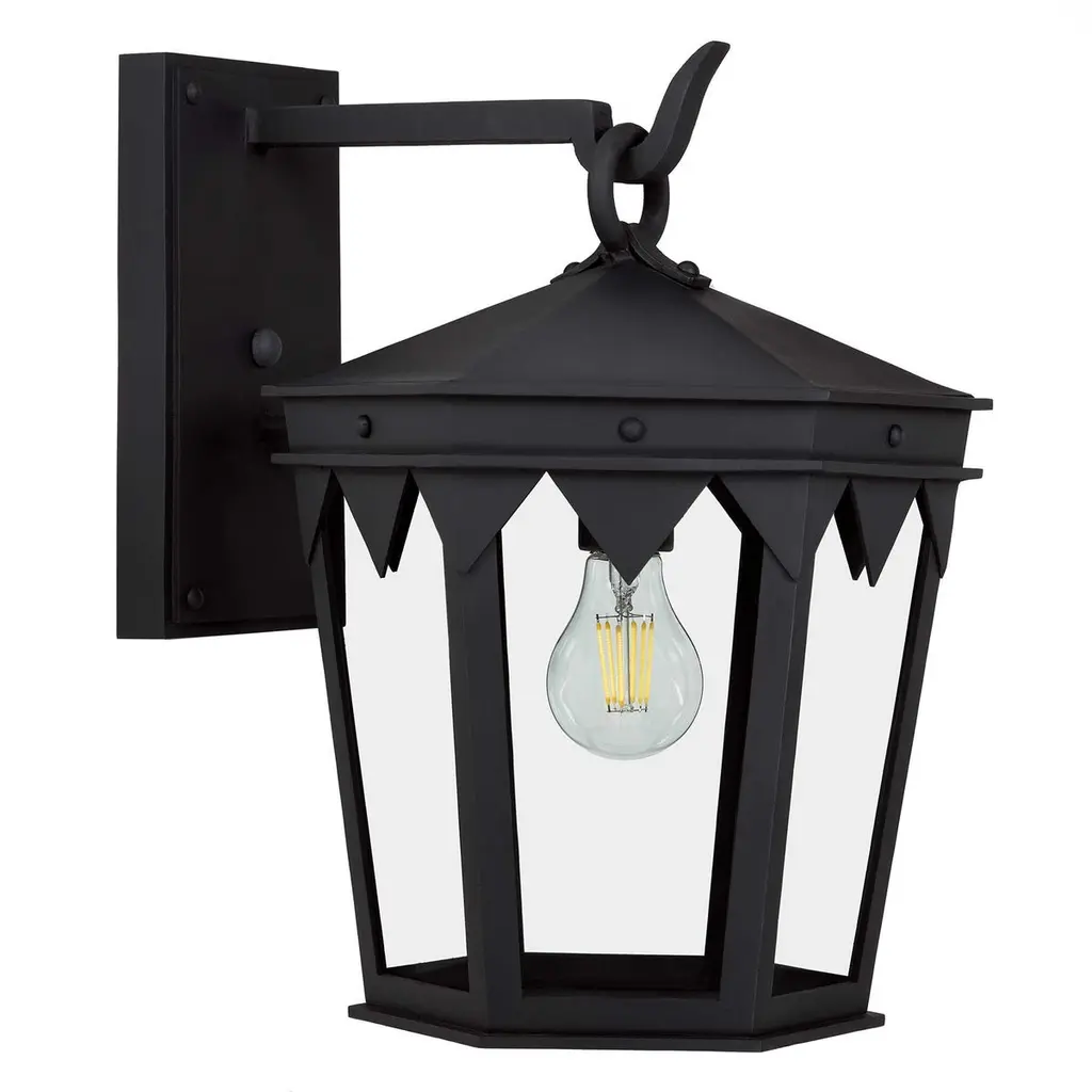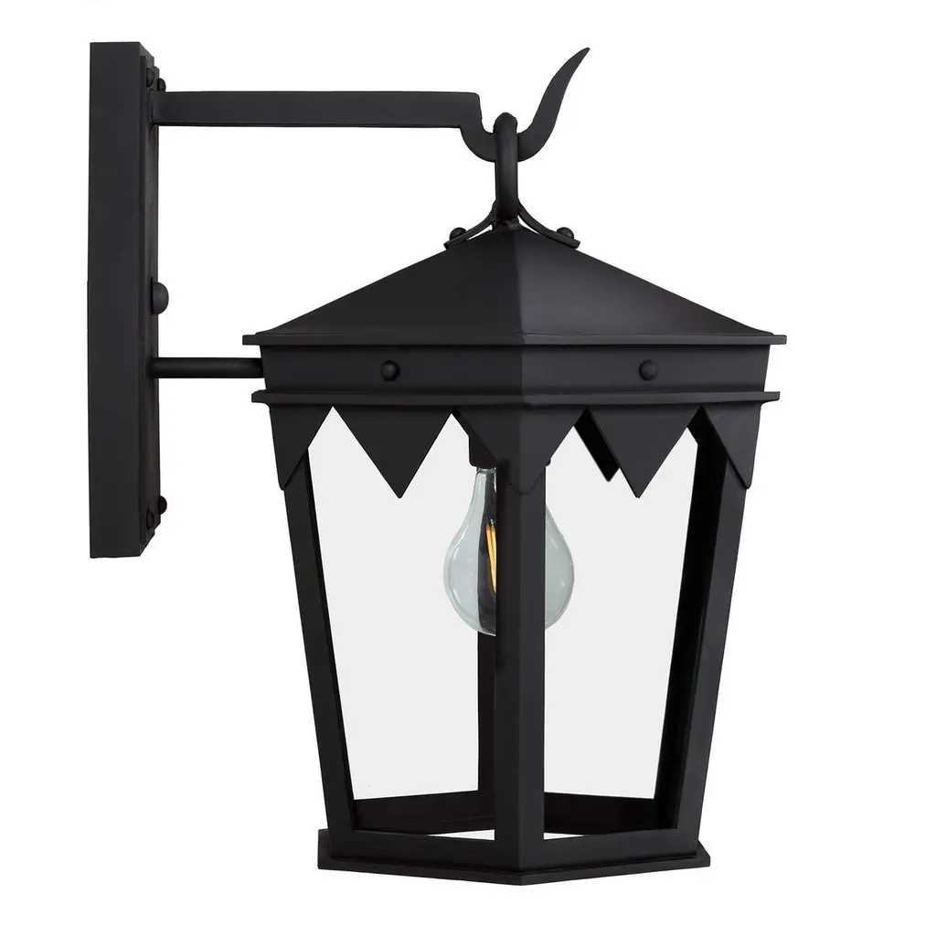 Designed to pair with the historic Oreña Adobe in Santa Barbara, a Spanish influenced top cresting, sharp geometries and six-sided tapered shape. Backplate dimensions (inches): 5" W x 9" H.Lantern shown in SBLC Grey Finish with SBLC Clear Glass. Hand-forged in heavy gauge wrought iron. All lanterns go through a metalizing process, a protective zinc layer added to ensure protection and durability against corrosion and harsh weather conditions.All lights are handmade and made to order. Dimensions may vary slightly.All lights ship with 5w LED Edison dimmable filament bulb.This lantern will ship within 8-10 weeks. Larger orders may have longer lead times. As with any handcrafted product, slight discrepancies are inherent in the art of forged iron, and even considered desirable as they indicate our old-world craftsmanship. Natural variations in tone, texture, and color may occur as our finishes are hand painted.