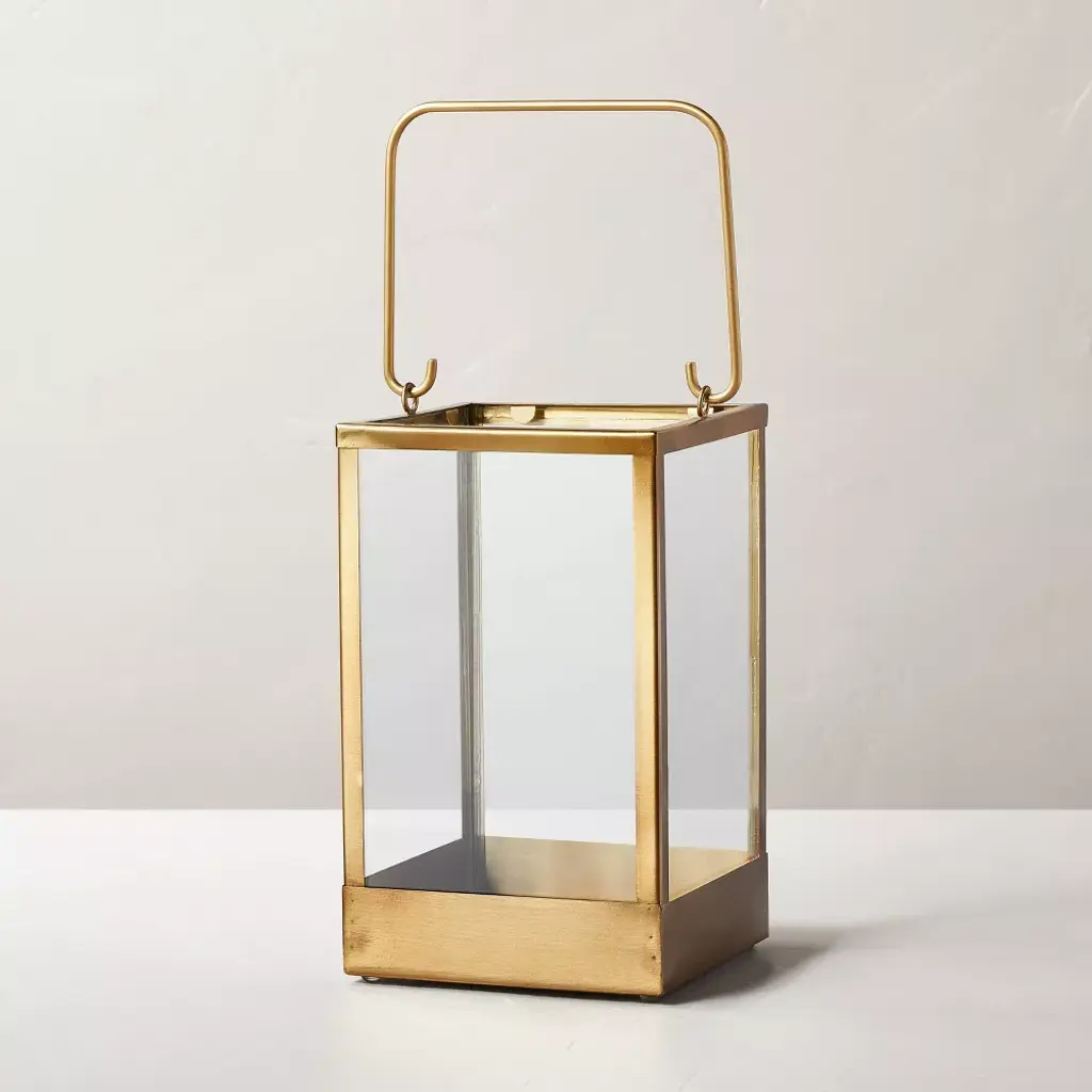 Spruce the look of your abode with this Square Metal & Glass Pillar Candle Lantern from Hearth & Hand™ with Magnolia. Elegantly designed in an elongated square shape, this lantern boasts a metal construction with antique finish for a lovely look. The built-in top handle makes it convenient to carry around your home, while the easy-to-open door makes placing and removing the candle convenient. Whether you're entertaining guests or creating a candlelit dining setting, this pillar candle lantern will help you create the right ambiance with additional lighting. Hearth & Hand™ with Magnolia: Gather ∙ Create ∙ Enjoy