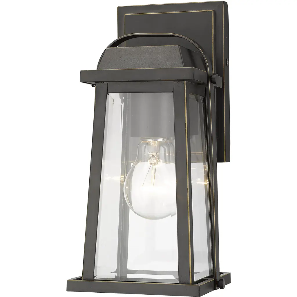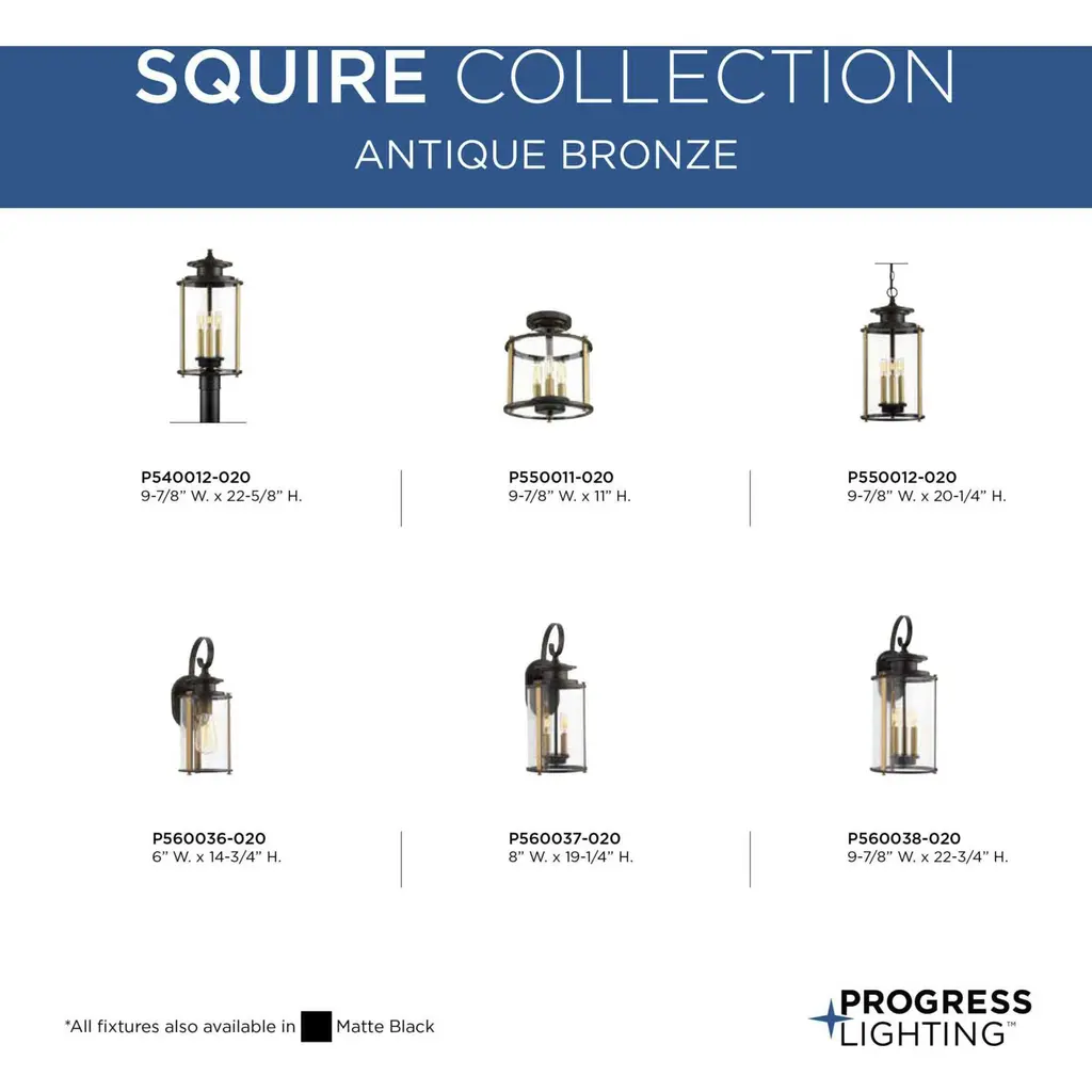 Squire two light medium wall lantern features a classic traditional profile with clean, modern metal fittings. The Antique Bronze finish is accented with contrasting Vintage Brass metallic elements, the cylindrical frame is comprised of a clear glass diffuser.