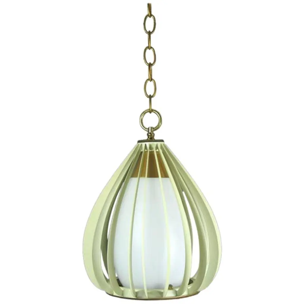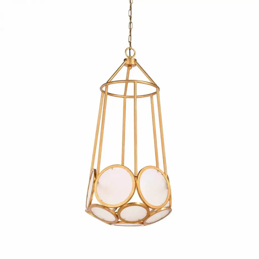 Open metal work lantern featuring stem and leaf detail in gold leaf. Comes with six feet of chain. Designed by Claire Bell.