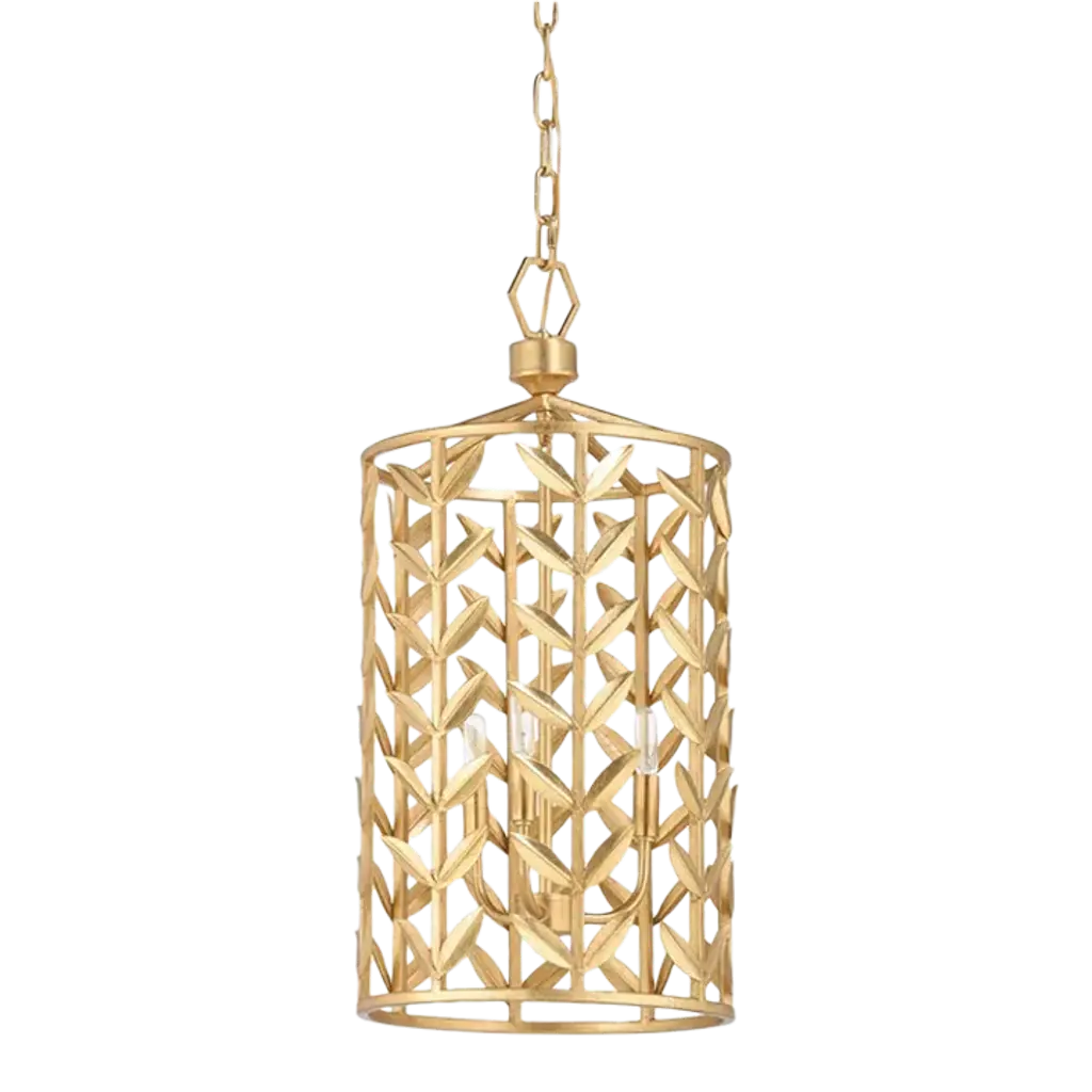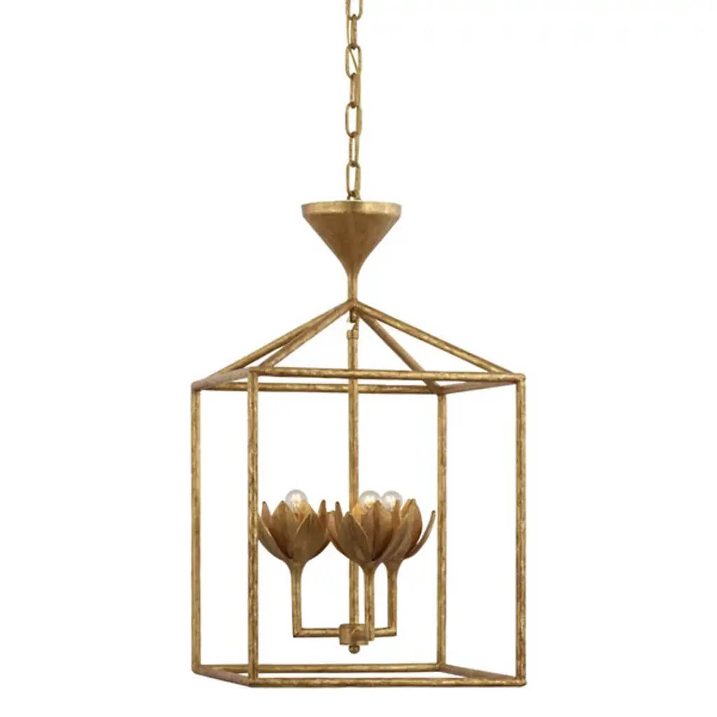 Open Metal Work Lantern Featuring Stem And Leaf Detail In Gold Leaf. Comes With Six Feet Of Chain.