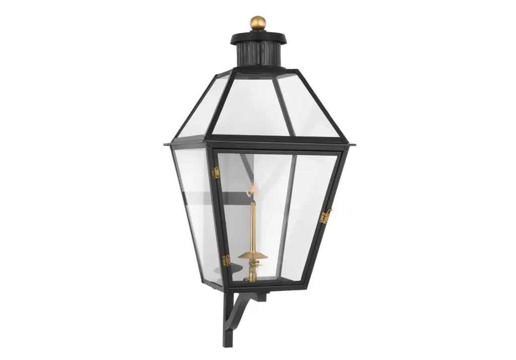 Chic yet traditional, this sizable lantern feels historic, styling well into entryways, around mantles, or in a library. Available in copper or bronze, its thin frame is complemented by clear glass panels, easily showcasing the natural gas flame inside.