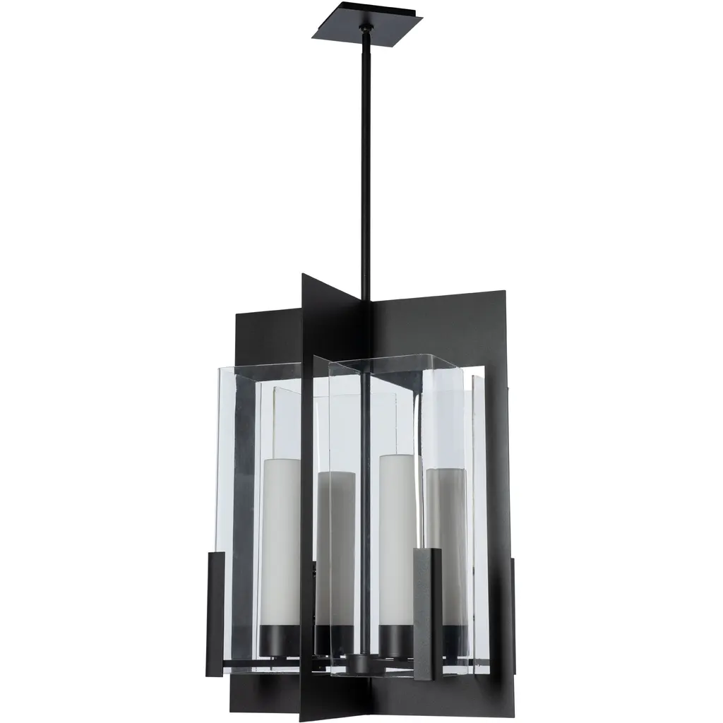 Looking for a traditional lantern with a contemporary twist The Summit is a large scale interior lantern featuring four lit frosted cylinders within large, clear vertical rectangular glass. Intersecting steel plates give a modern, dramatic feel, with both glass and steel elements having clean 90 degree angles.