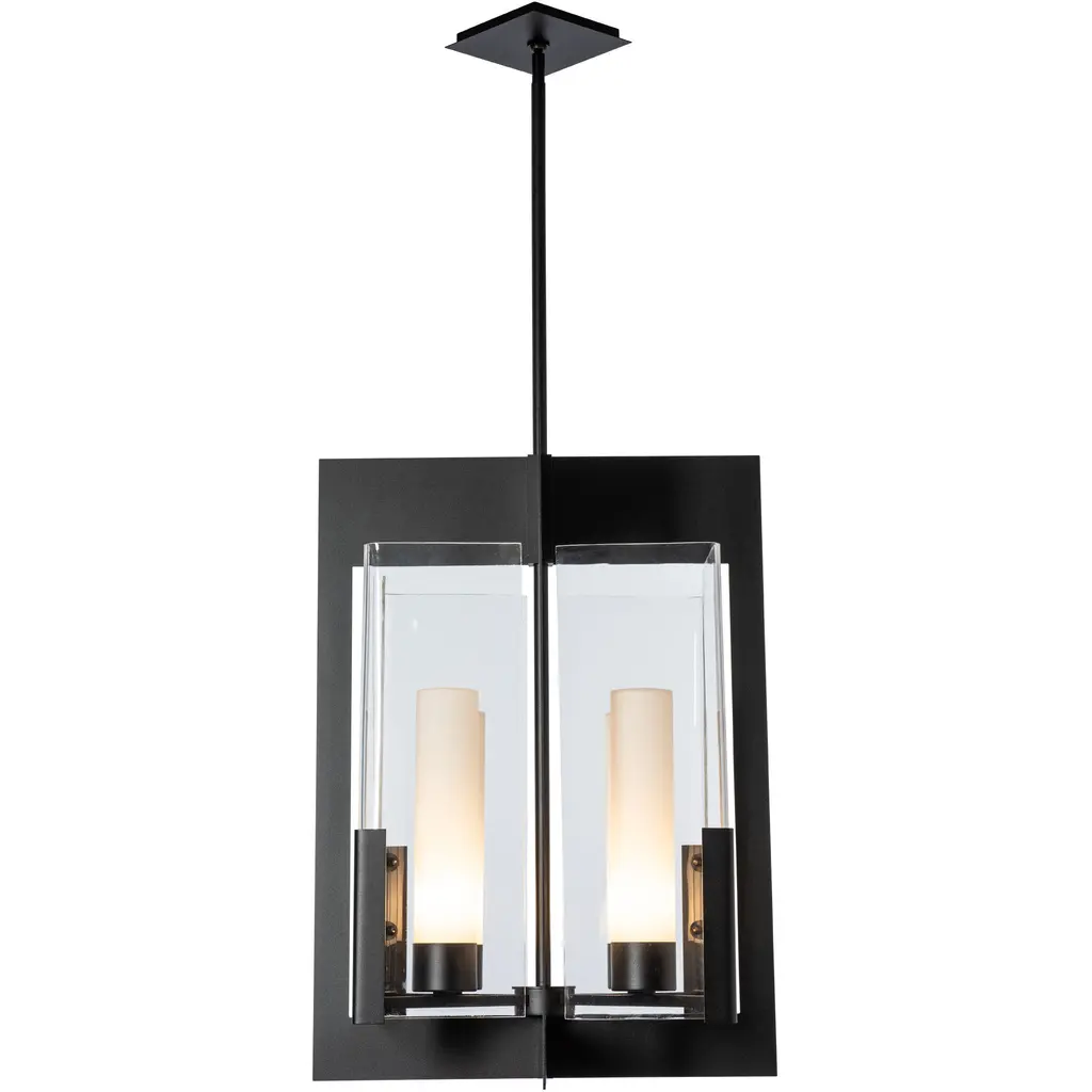 Looking for a traditional lantern with a contemporary twist The Summit is a large scale interior lantern featuring four lit frosted cylinders within large, clear vertical rectangular glass. Intersecting steel plates give a modern, dramatic feel, with both glass and steel elements having clean 90 degree angles.