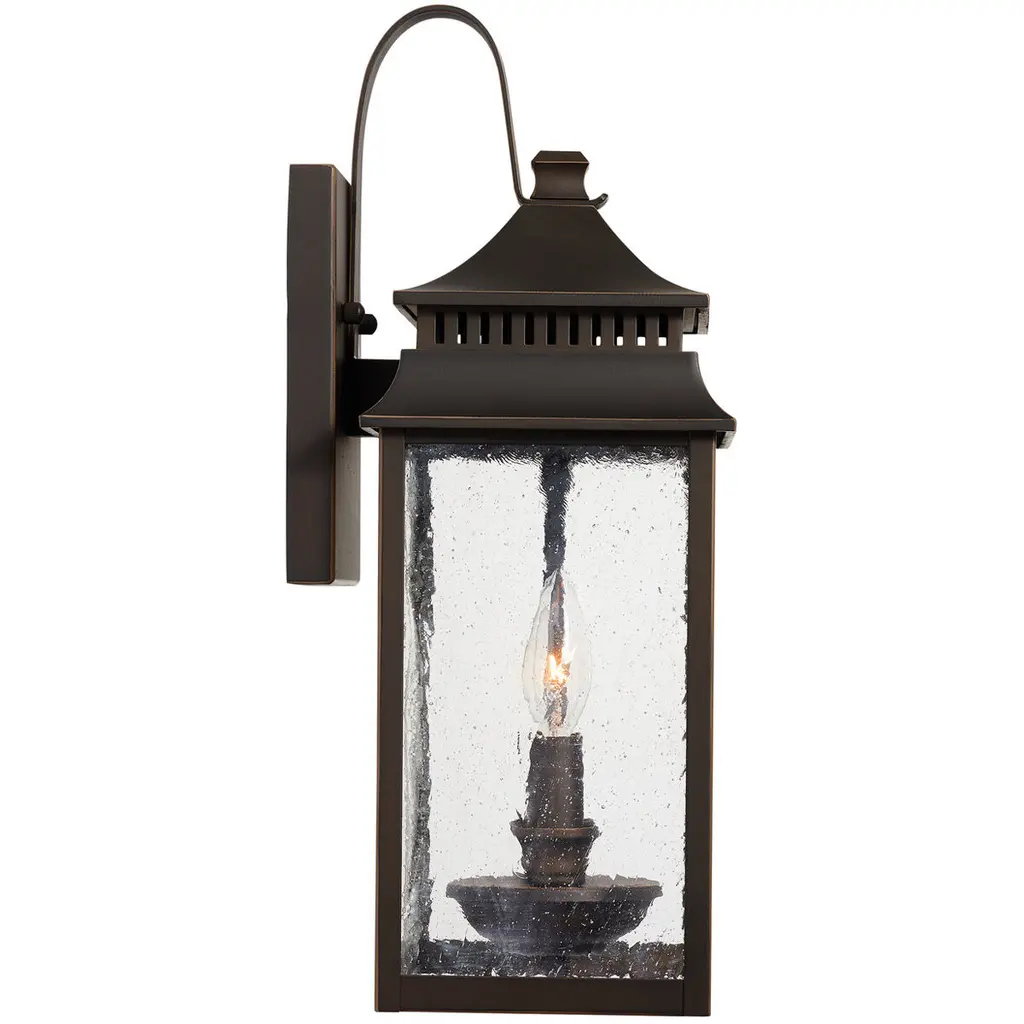 The pagoda-shaped lanterns in this outdoor collection are finished in Oiled Bronze, which feels beautifully aged with time. Each piece is crafted out of aluminum and finished with a UV-inhibitor protective powder-coat. Featuring antiqued rain glass and clean lines, these fixtures look great in all elements.