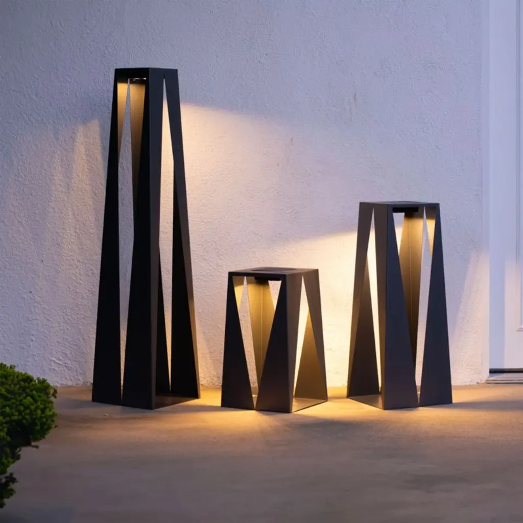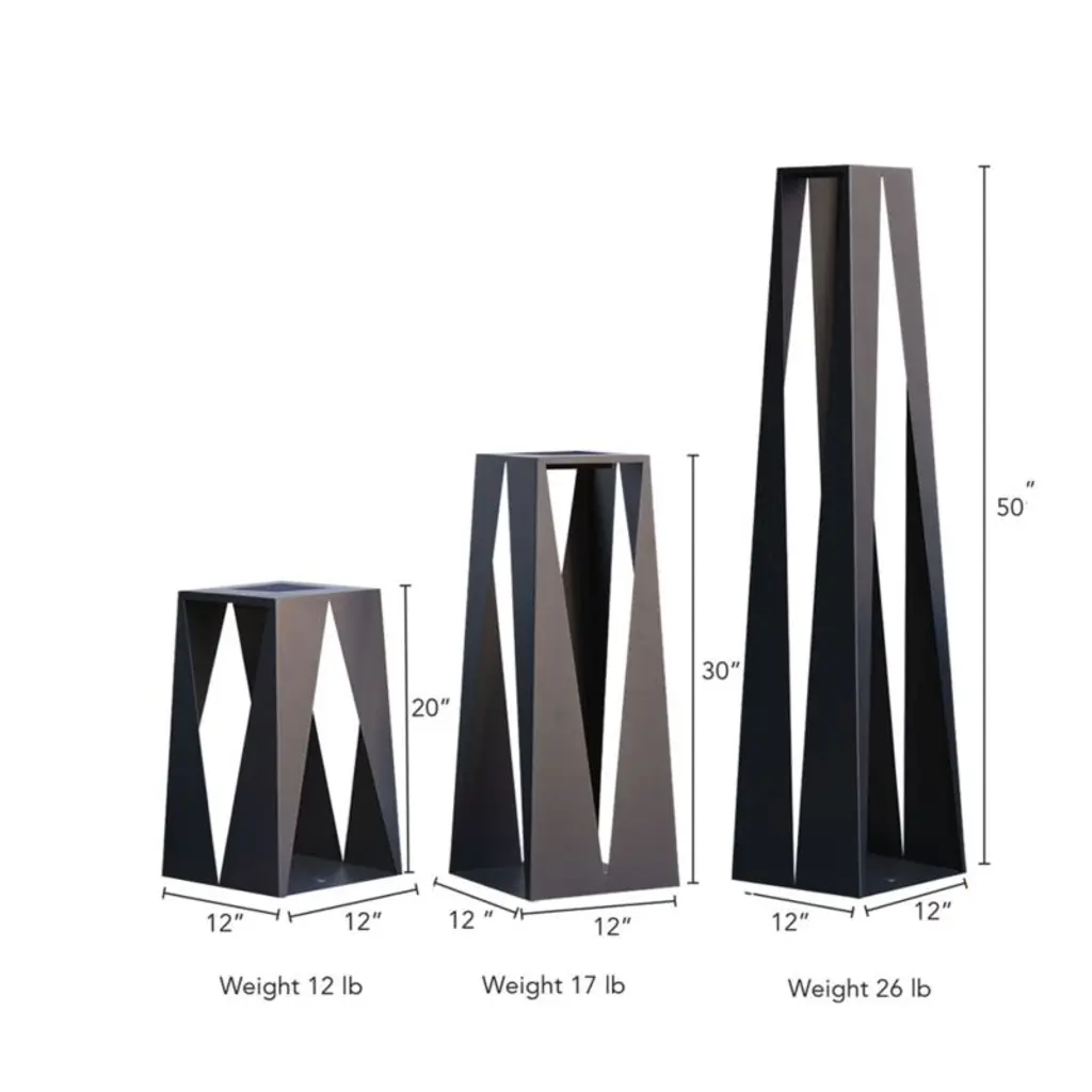 Makers of high-efficiency solar lighting, Les Jardins illuminates outdoor spaces with lanterns that deliver long-lasting light along with high style. Made of carbon steel with a chic cfe brown finish, the tall lantern has an airy, architectural design that adds graphic punch to an outdoor patio, garden or front entrance. LED lights shine into a conical reflector at the top, broadcasting a pleasing mix of ambient warmth and bright light shown through the frame's triangular cutaways.