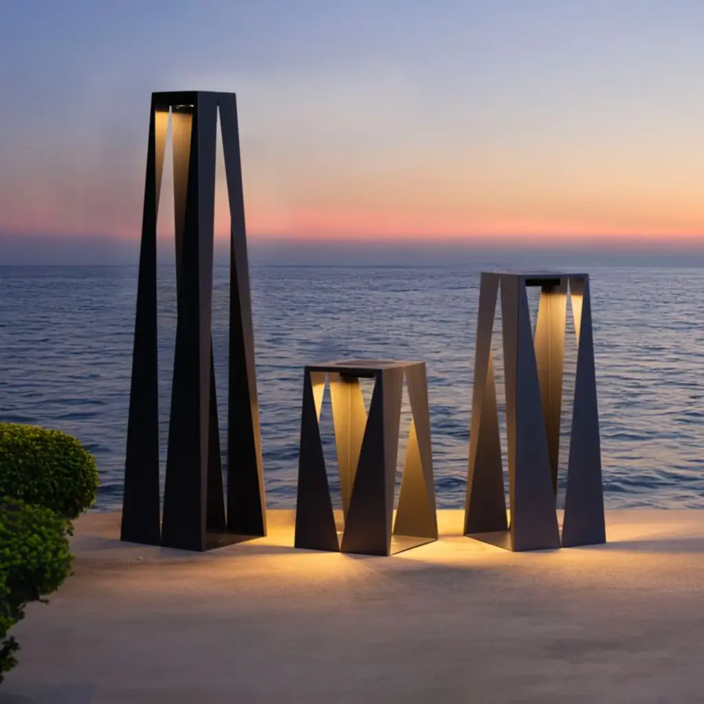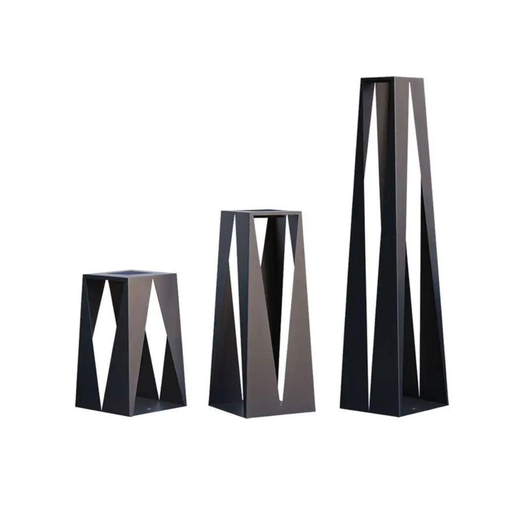 Makers of high-efficiency solar lighting, Les Jardins illuminates outdoor spaces with lanterns that deliver long-lasting light along with high style. Made of carbon steel with a chic cfe brown finish, the tall lantern has an airy, architectural design that adds graphic punch to an outdoor patio, garden or front entrance. LED lights shine into a conical reflector at the top, broadcasting a pleasing mix of ambient warmth and bright light shown through the frame's triangular cutaways.