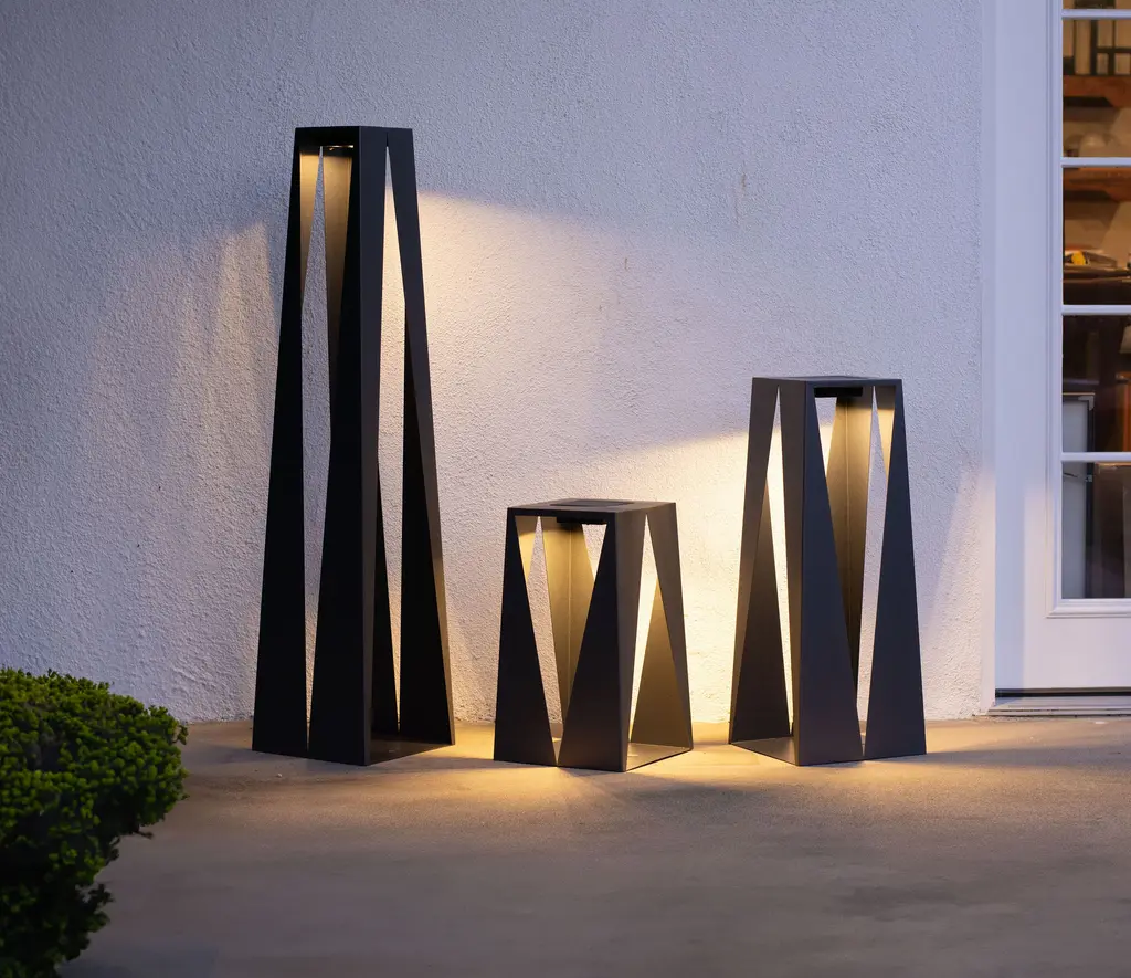 Illuminate your outdoor space with the sculptural beauty of the Teatree Solar Outdoor Lantern from Les Jardins. Featuring an elegant angular design and robust carbon steel frame, this high-end lantern offers a perfect mix of ambient warmth and bright illumination, powered either by the integrated solar panel or a micro USB. Highlights