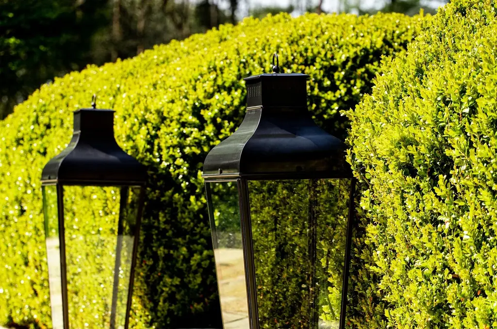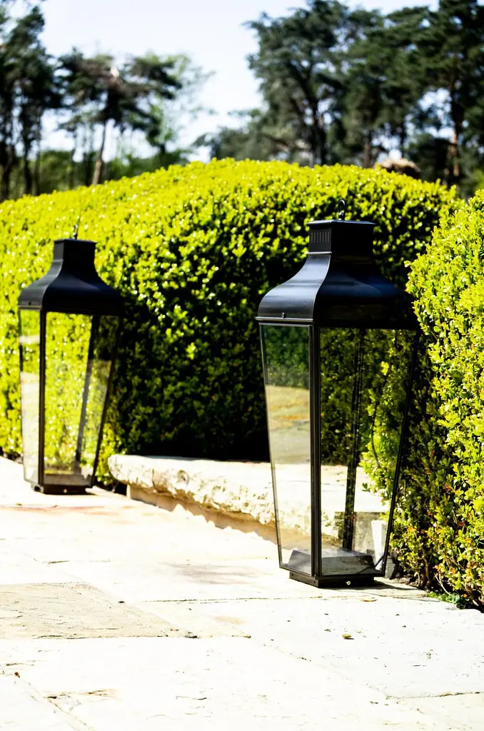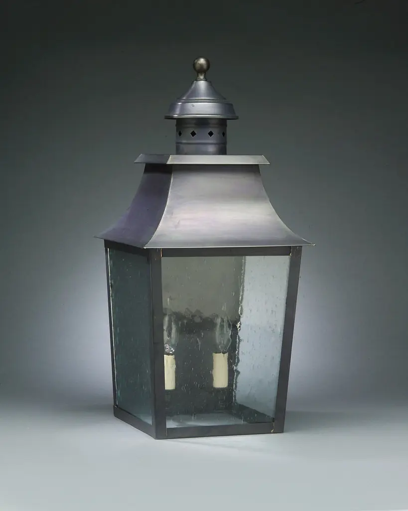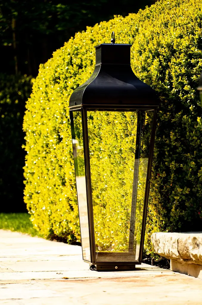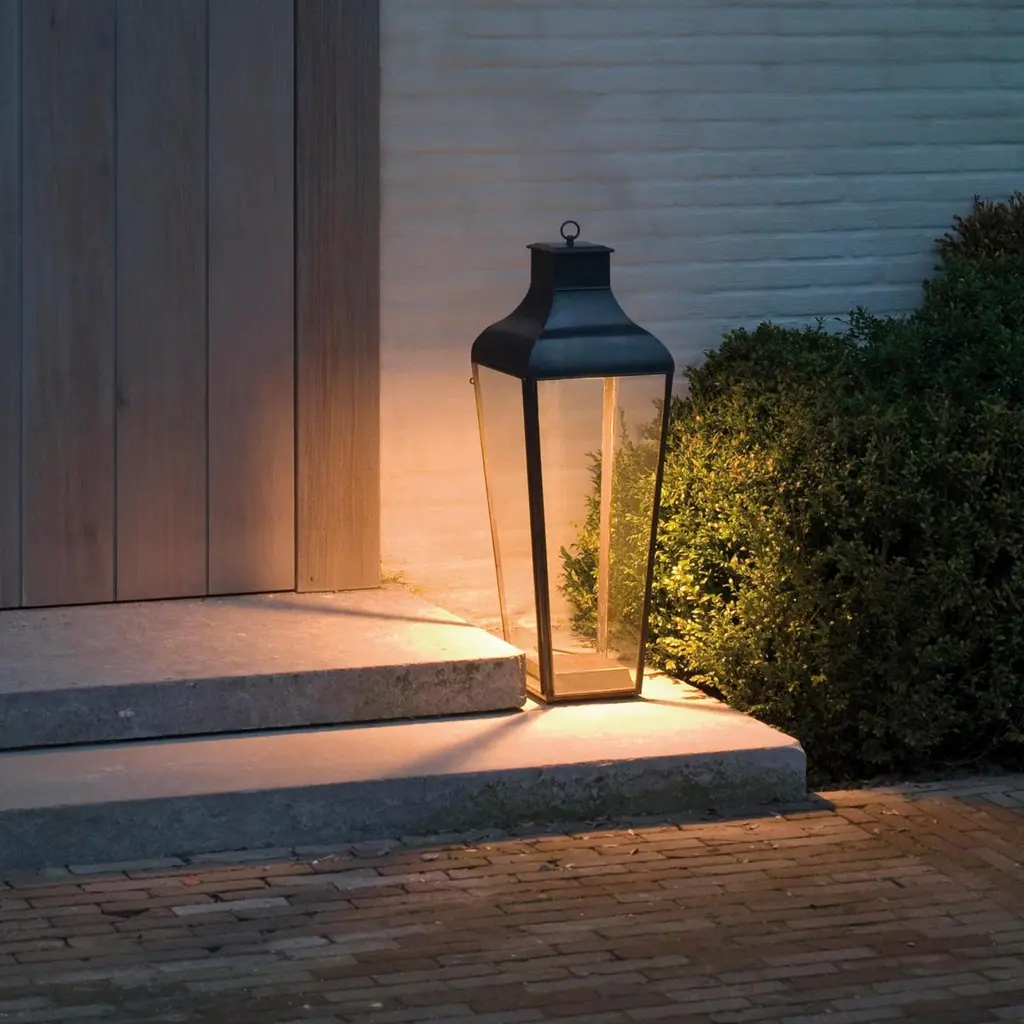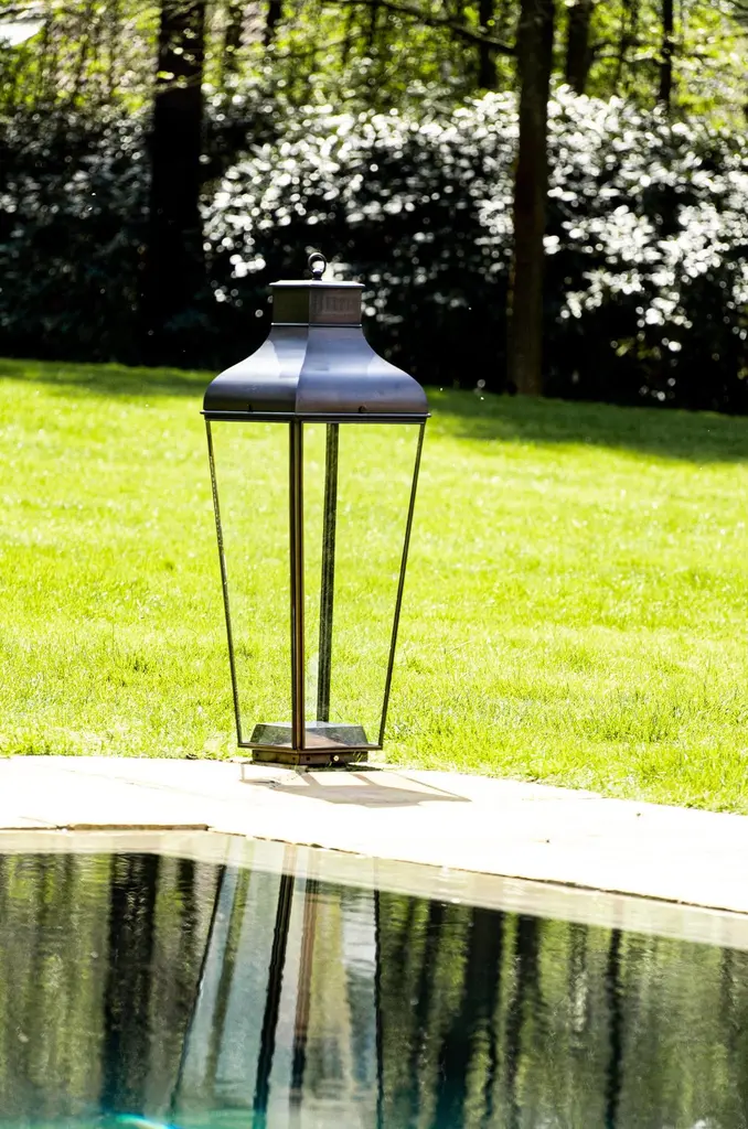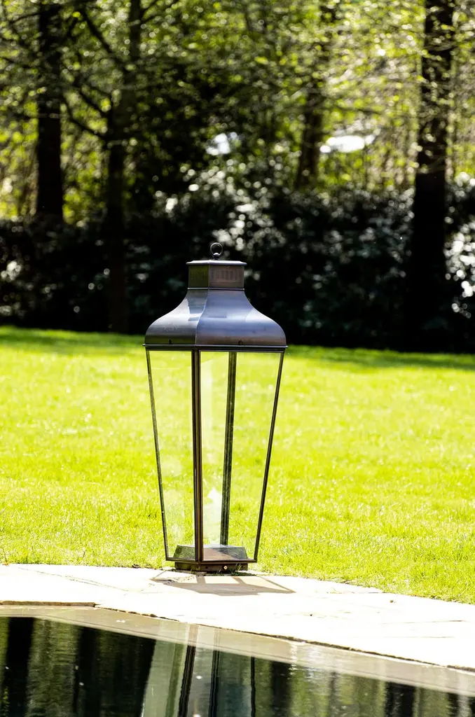 Floor lantern in brass with pagoda structure and handle (eyelet) with outside fitted clear glass, indirect lighting, 5 meter cable H05RNF and plug. For outdoor use (IP40). Fixation to the ground for outdoor use.High power LED 6W - 2700K - CRI 85 - LED driver. Main power 110V/240V 50/60Hz.