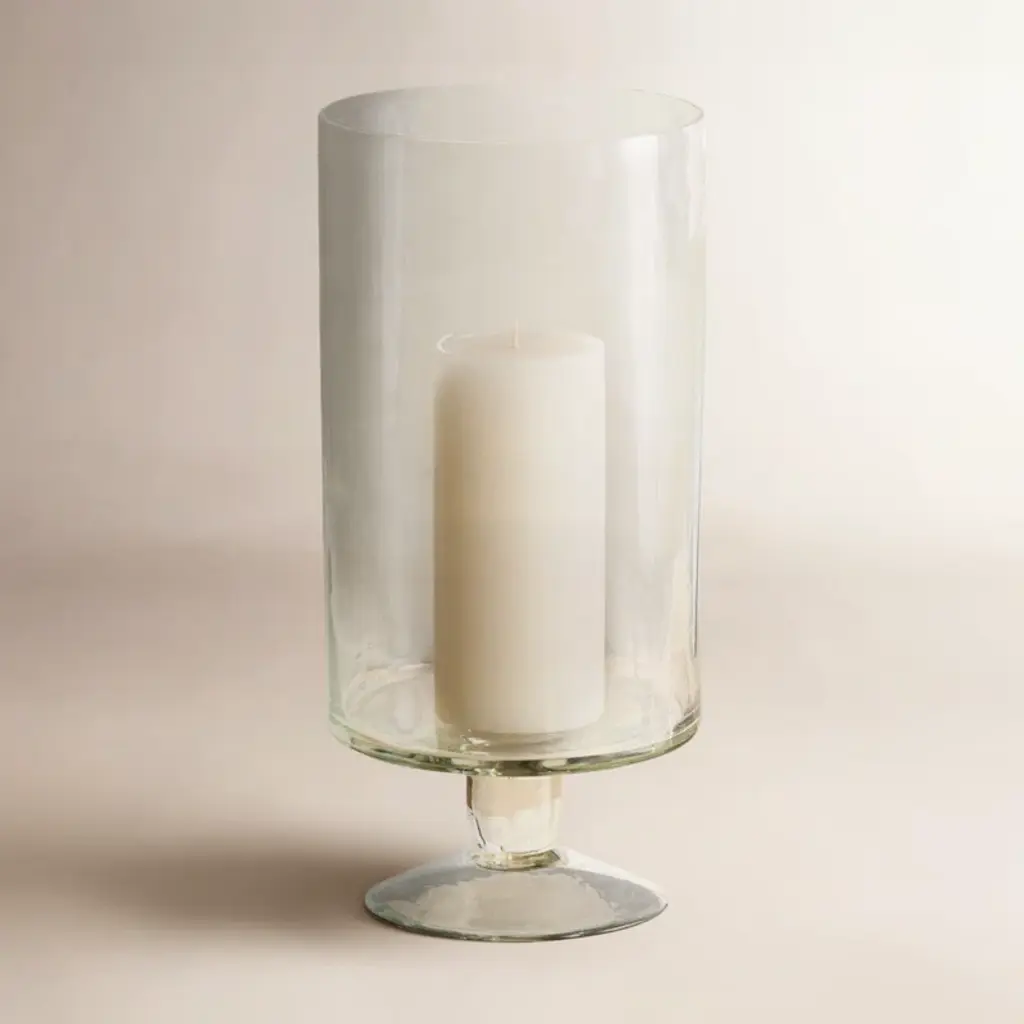 A column-shaped lantern which curves at the base then flares to a solid glass foot. Solid glass foot Cylindrical shape Curved base